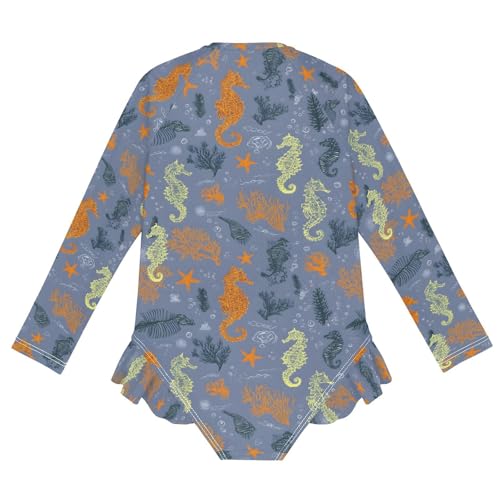 sought-after ! ALAZA Orange Seahorse Coral Reef Blue Girls One Piece Swimsuit Long Sleeve Rash Guard Swimsuits UV 50+ Swimwear Zipper