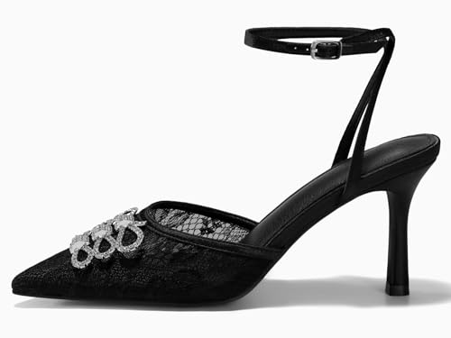 More information about Coutgo Womens Rhinestone High Heels Closed Pionted Toe Bow Mesh Pumps Ankle Strap Wedding Bride Dress Shoes