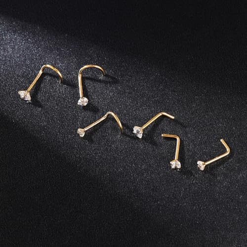 SYLWIA 14K Solid Gold Nose Studs Rings 20g 18g, Moissanite Corkscrew L Shaped Nose Rings, Hypoallergenic 18 20 Gauge Nose Ring Piercing for Women Men Gifts - 2mm 2.5mm 3mm Moissanite