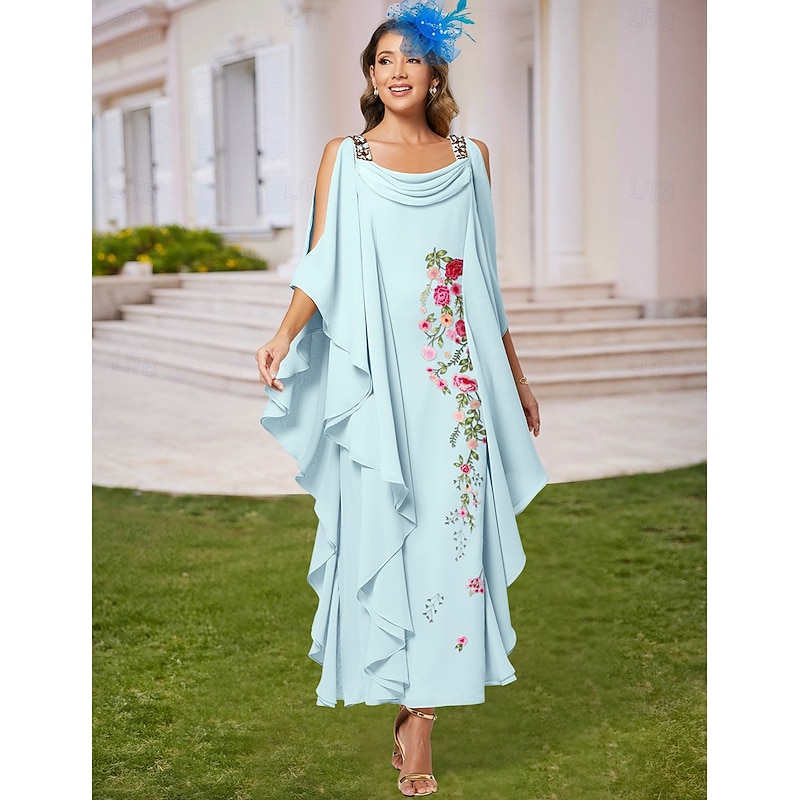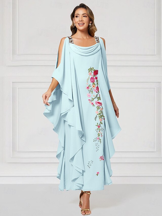 More information about Floral Column Mother of the Bride Dress Elegant Plus Size Jewel Neck Floor Length Chiffon Half Sleeve with Beading Tier Cascading Ruffles