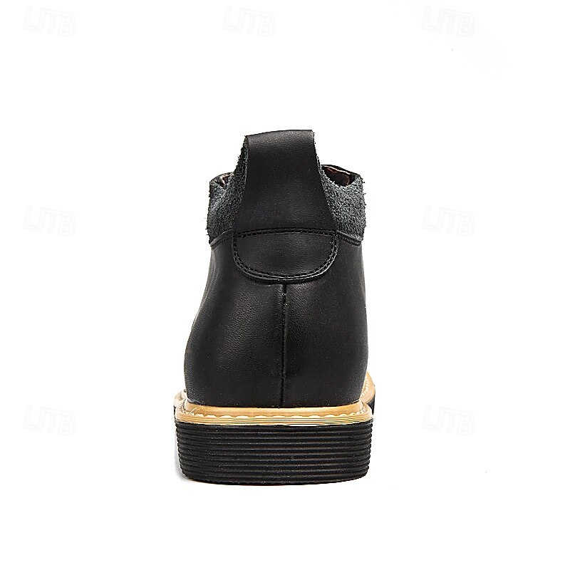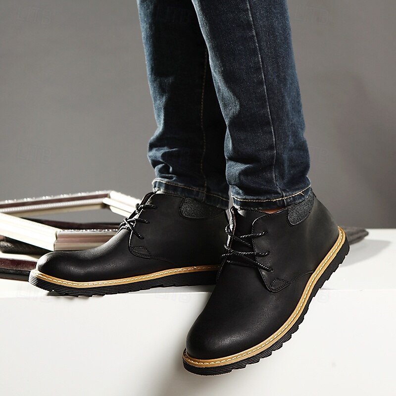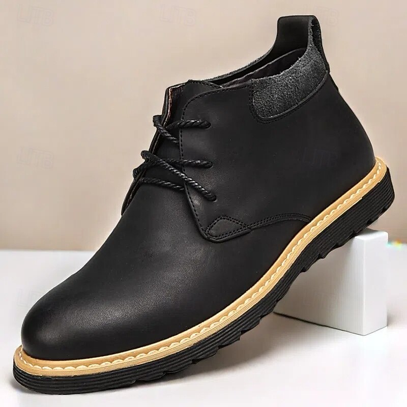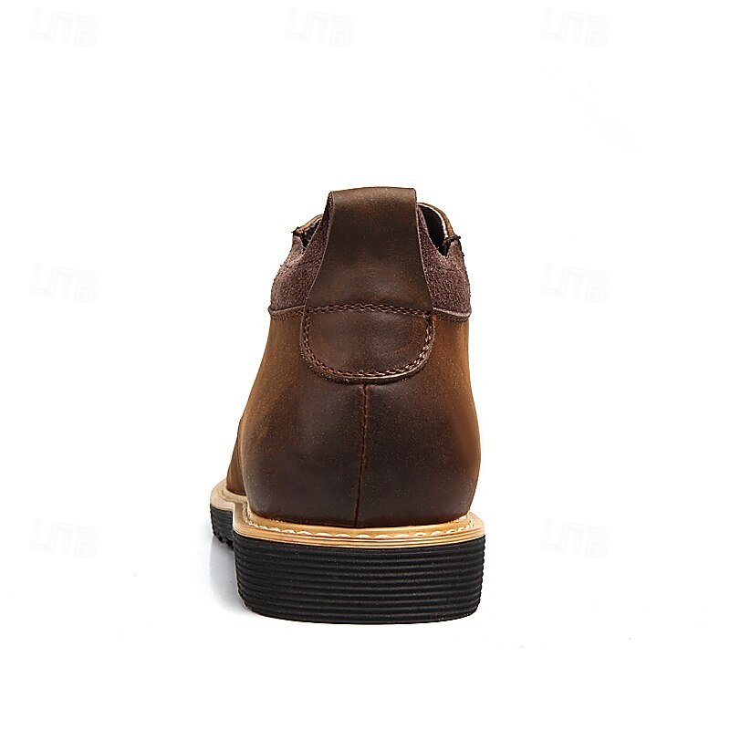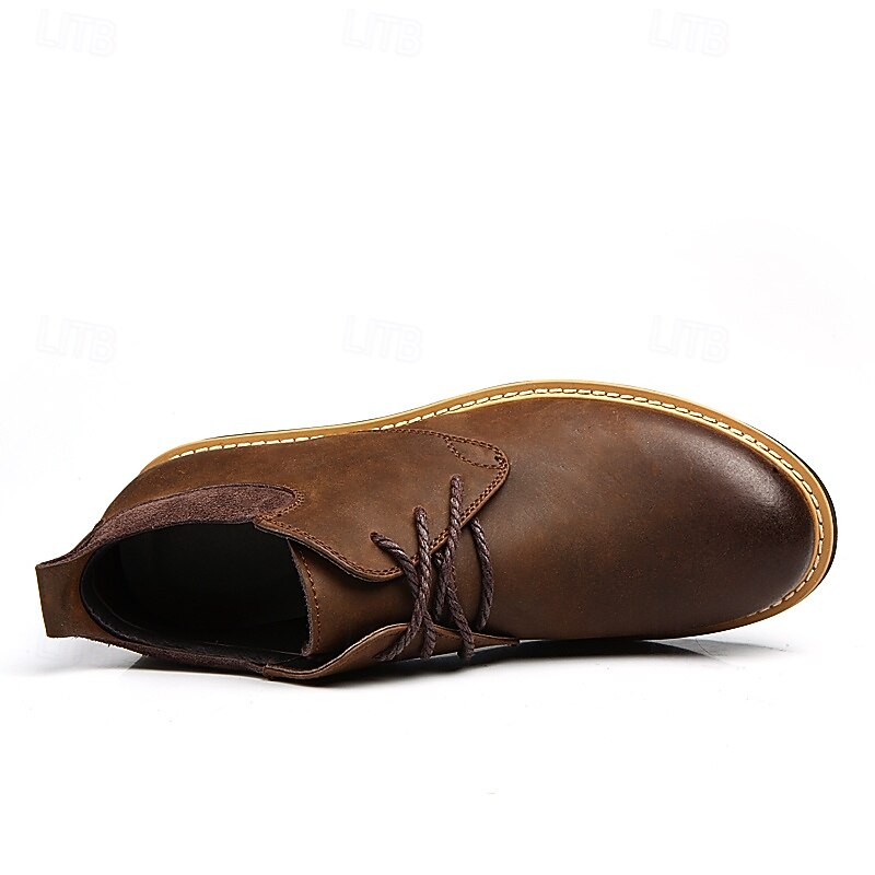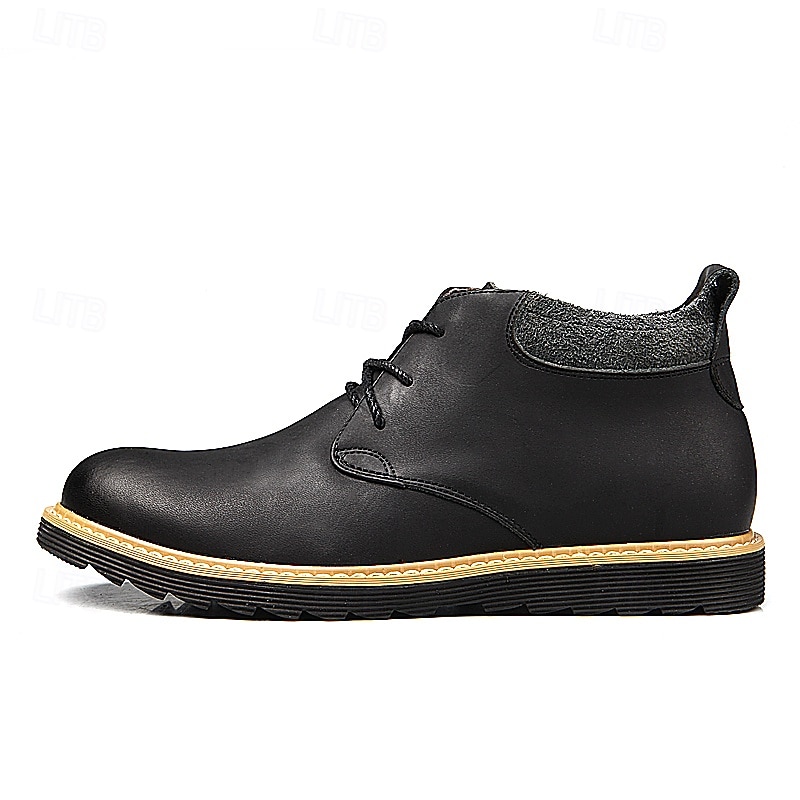 Highlights [Material] : Crafted from high-quality split leather, these men's ankle boots offer a luxe feel and durability for everyday wear. The genuine leather upper provides a sleek and polished look, while maintaining excellent flexibility and breathability. [Style] : Featuring a classic round toe design, these boots ensure ample space for comfort throughout prolonged wear. Their robust construction promises reliability and longevity, perfect for a variety of looks from casual to smart-casual events. [Design Highlights] : The boots showcase a timeless lace-up closure, ensuring a secure fit and adding a traditional appeal. The cushioned collar provides additional comfort around the ankle. The sole, made from durable rubber with a rugged tread pattern, offers superior grip and stability on various surfaces. A contrasting light-colored midsole adds a modern, trendy touch to the overall design. [Occasions] : Ideal for casual outings or smart-casual events, these boots pair perfectly with jeans or chinos. Whether for everyday activities or specific occasions, their versatile design adapts to various settings, making them a modern choice for multiple scenarios. [Size Range] : Available in a comprehensive range of sizes, from US6-10.5 (EU38-43, UK5-9.5), ensuring a suitable fit for a wide variety of customers. Perfect for everyday use. top-grade materials and excellent craftsmanship ensure long-lasting durability.