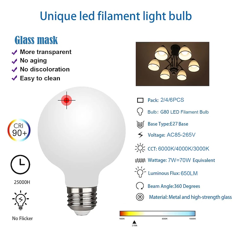 This 2/4/6PCS G80 7W Globe LED Edison Bulb 650lm E27 Base Opalescent Glass Facing Very Suitable for Dresser Vanity Mirror Floor Lamp AC85-265V combines elegant design with practical functionality. Every detail has been carefully considered to ensure you get the top possible experience. The supreme construction means this product will serve you well for years to come.