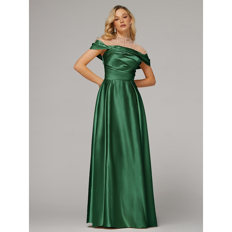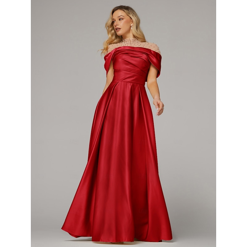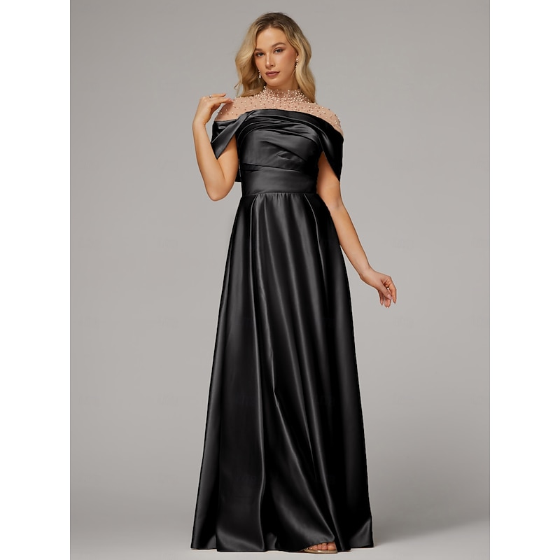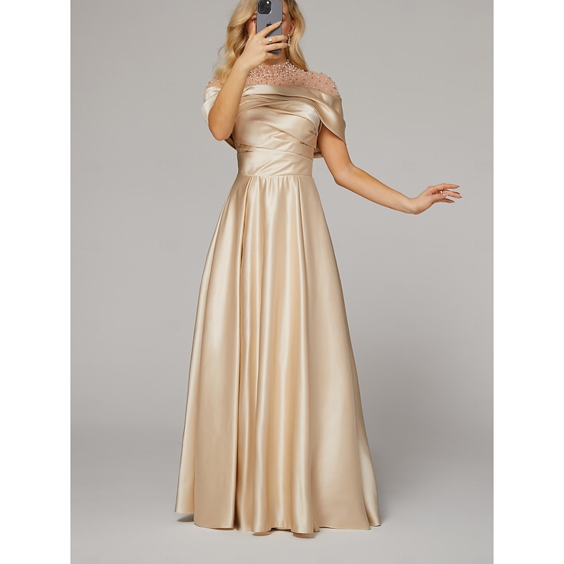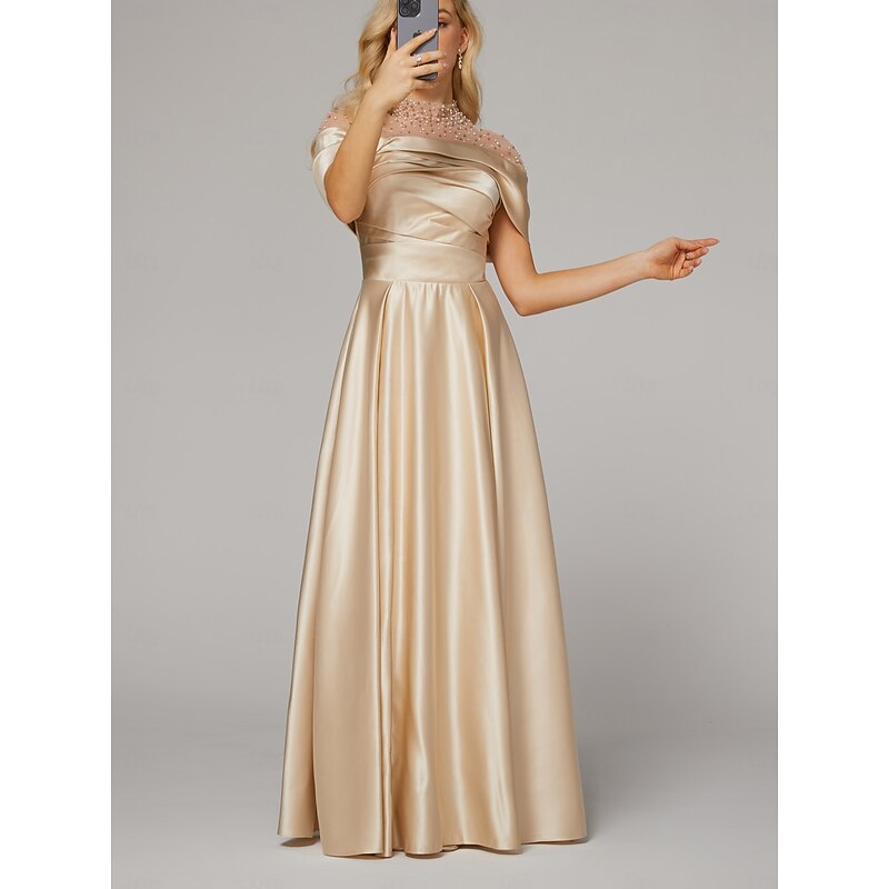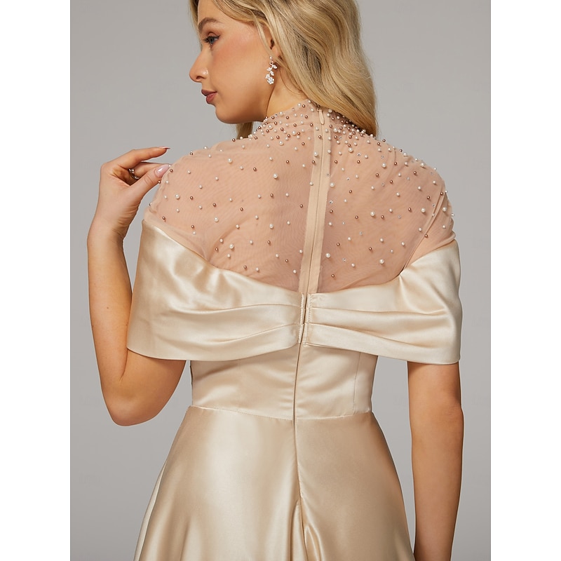 More information about A-Line Evening Gown Elegant Dress Formal Floor Length Short Sleeve Illusion Neck Satin with Ruched Beading
