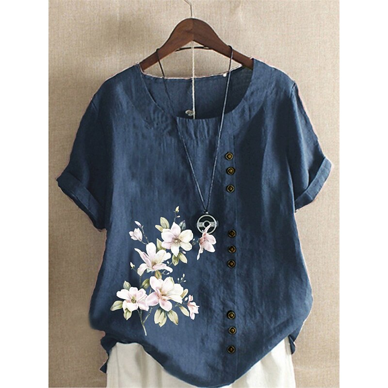 Women's 100% Cotton Shirt Floral Streetwear Short Sleeve Crewneck Regular Tops Linen Vacation Daily Going out Buttons Print Navy Blue Blue Army Green Light Blue Coffee Summer Spring 17