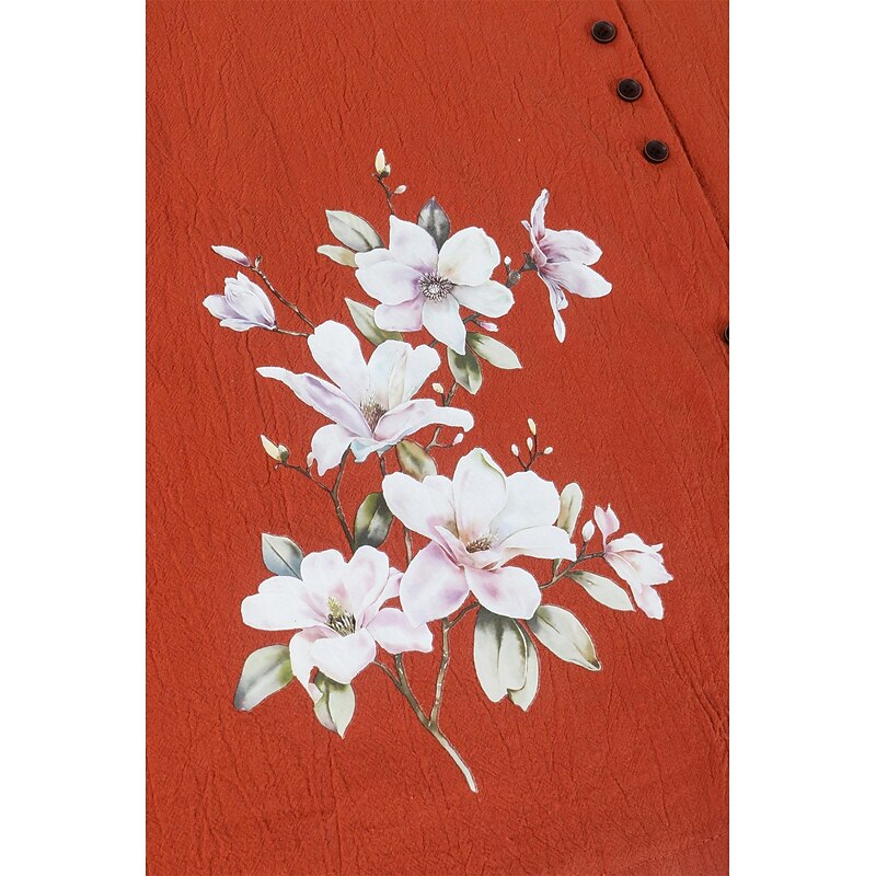 Highlights [Fabric] : Crafted from a blend of breathable cotton and linen, this women's blouse offers a lightweight and airy feel, perfect for warm spring and summer days. The fabric features a micro-elastic quality, ensuring comfort and ease of movement throughout your day. [Fit] : This blouse comes in a regular fit, designed to flatter various body types. Its relaxed silhouette allows for a comfortable and effortless style, making it an ideal choice for both casual and semi-formal settings. [Design Highlights] : Featuring a classic crew neckline and short sleeves with chic rolled hems, this blouse exudes modern elegance. The front is stylishly detailed with a line of decorative buttons, while a stunning floral print with delicate white blossoms and subtle green leaves adds a natural, elegant touch. [Occasions] : Perfect for vacations, everyday outings, or weekend adventures, this versatile blouse combines style and comfort seamlessly. Its design makes it suitable for both relaxed days and more intimate gatherings, adding a fresh and chic look to any event. [Size Range] : Available in sizes L, XL, and XXL, this blouse offers options to accommodate a wide range of body shapes and preferences. Enjoy the comfortable fit and stylish appeal tailored to suit your needs.