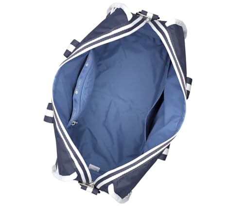 • Rich dark navy blue and crisp white pair together in a modern 2 tone spectator style weekender & features a subtle sheen. Deep navy blue & white 2 tone strap/trim & contrasting slate blue interior lining. Favorite lightweight ripstop nylon in new environmentally conscious recycled material.