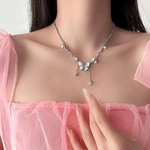 HOT ! Silver Rhinestone Butterfly Necklace for Women Y2K Irregular Pearl Bow Y Necklace Sparkly Crystal Butterfly Pendant Necklace Adjustable Cubic Zirconia Butterfly Chain Necklace Fashion Gemstones Accessories Jewerly