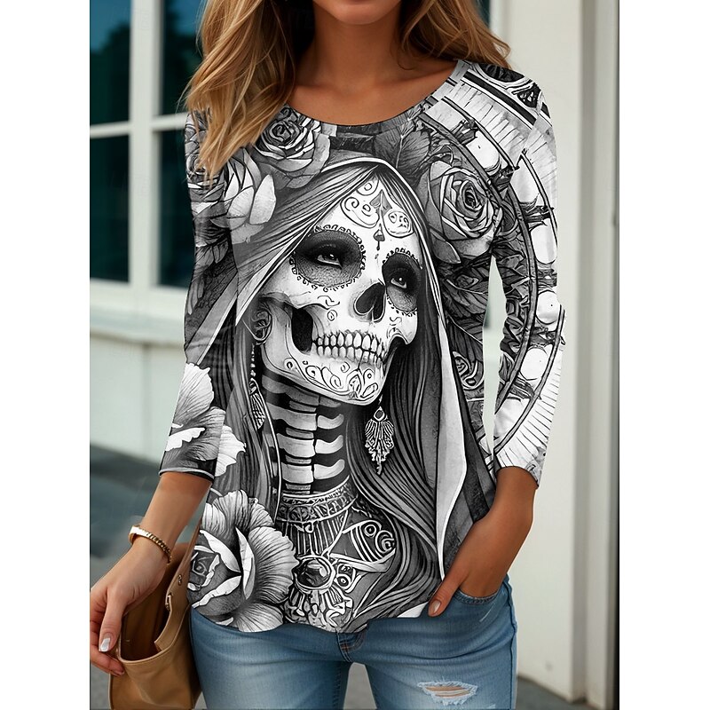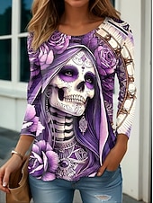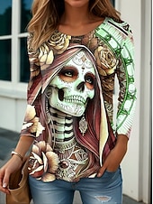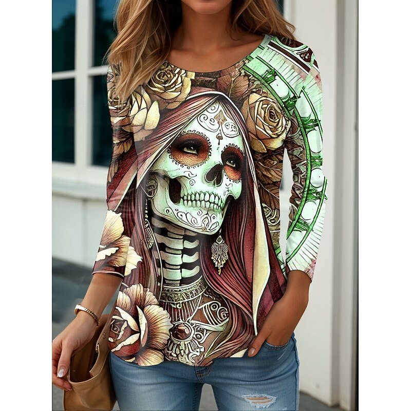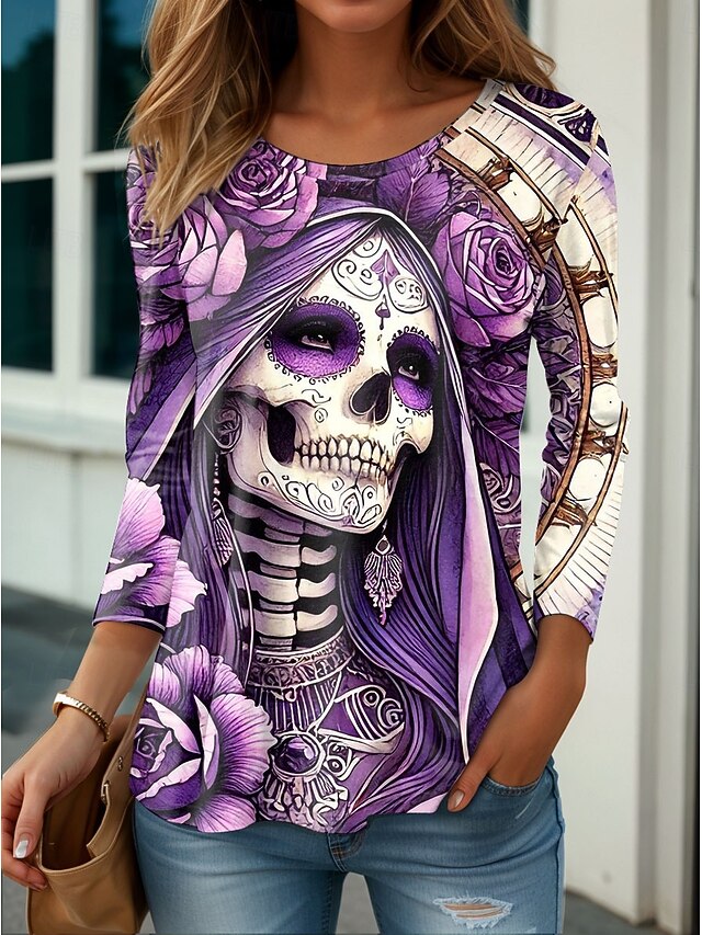 More information about Halloween Women's T Shirt Skulls Floral Graphic Vintage Stylish Classic Long Sleeve Crew Neck Regular Tops Daily Print Blue Purple Orange Green Gray Spring Fall Winter
