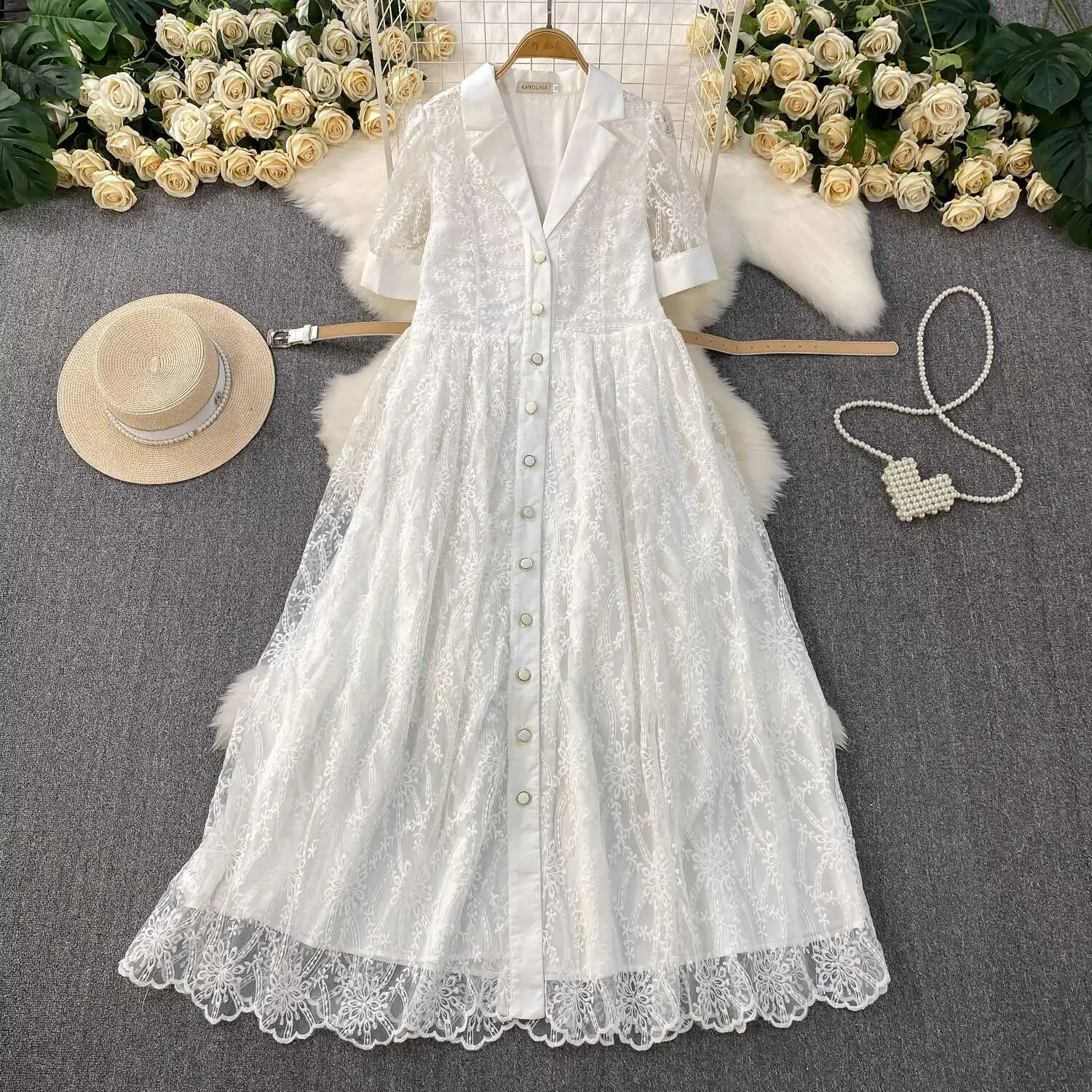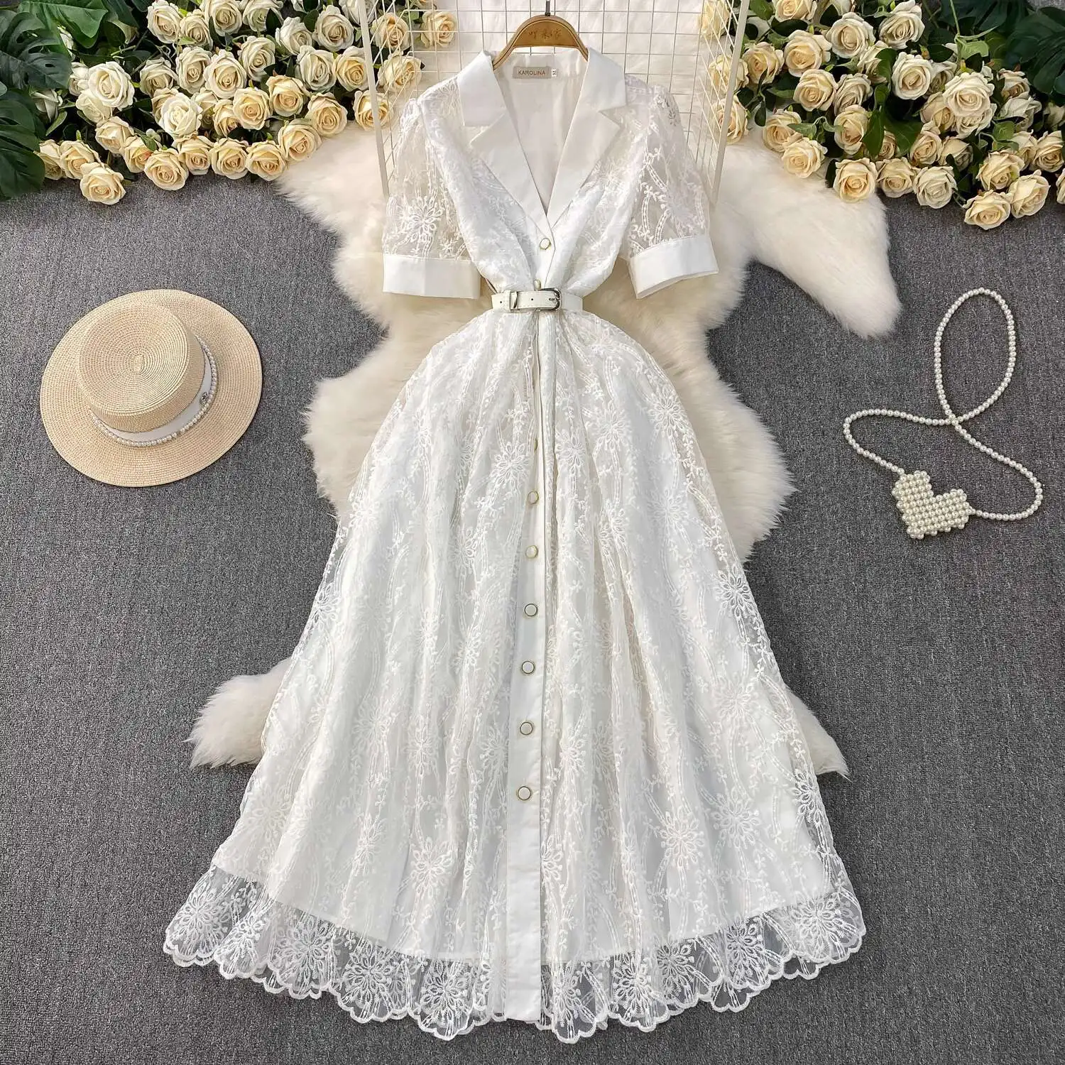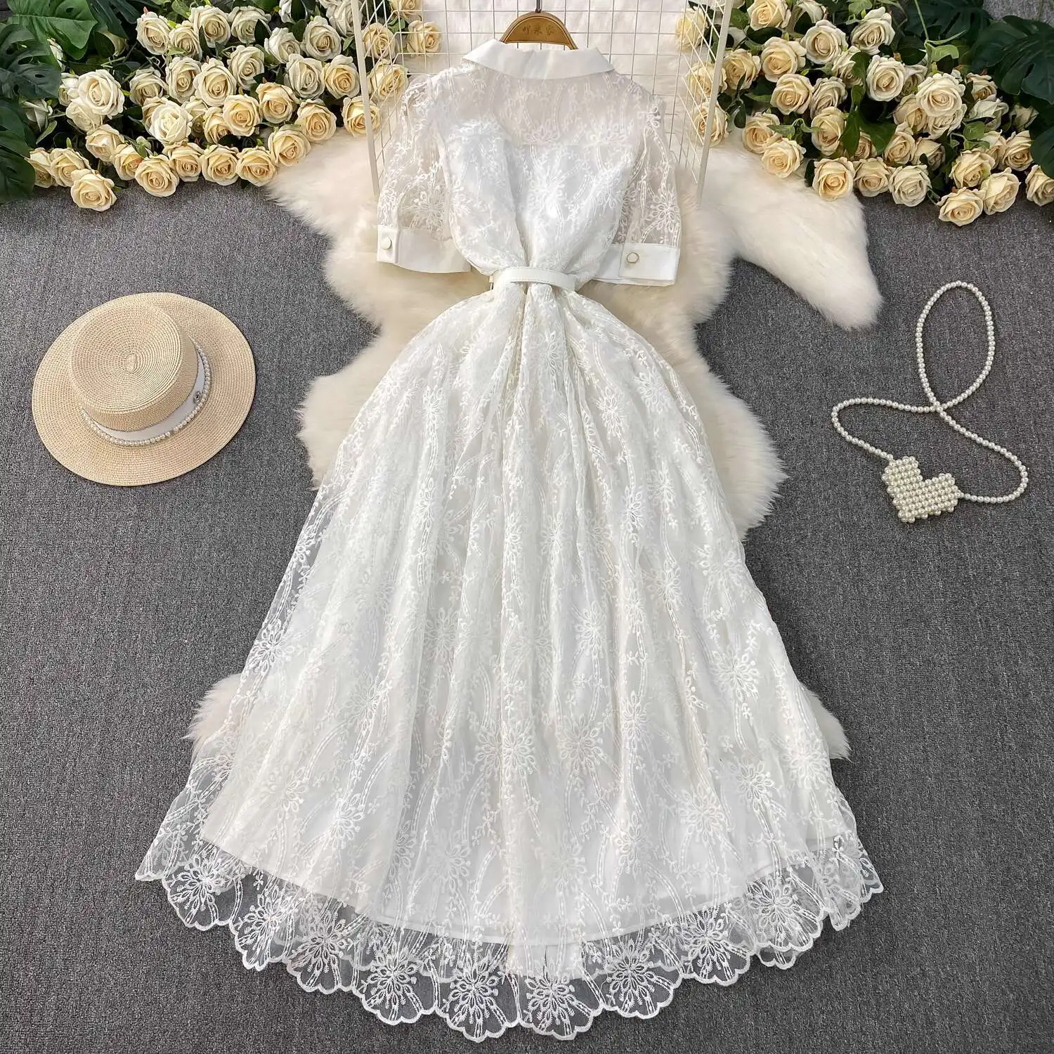Designer Runway Luxury Formal Evening Dress Women Blazer Suit Collar Summer Short Sleeve Embroidery Lace Long Dresses Party Robe