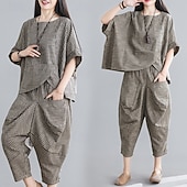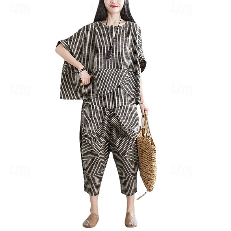 More information about Women's Active Fashion Blouse Pants Sets Short Sleeve Crew Neck Striped Going out Casual Daily Black Summer Regular Fit