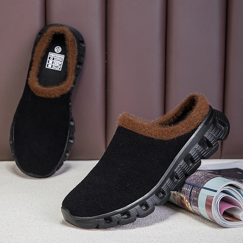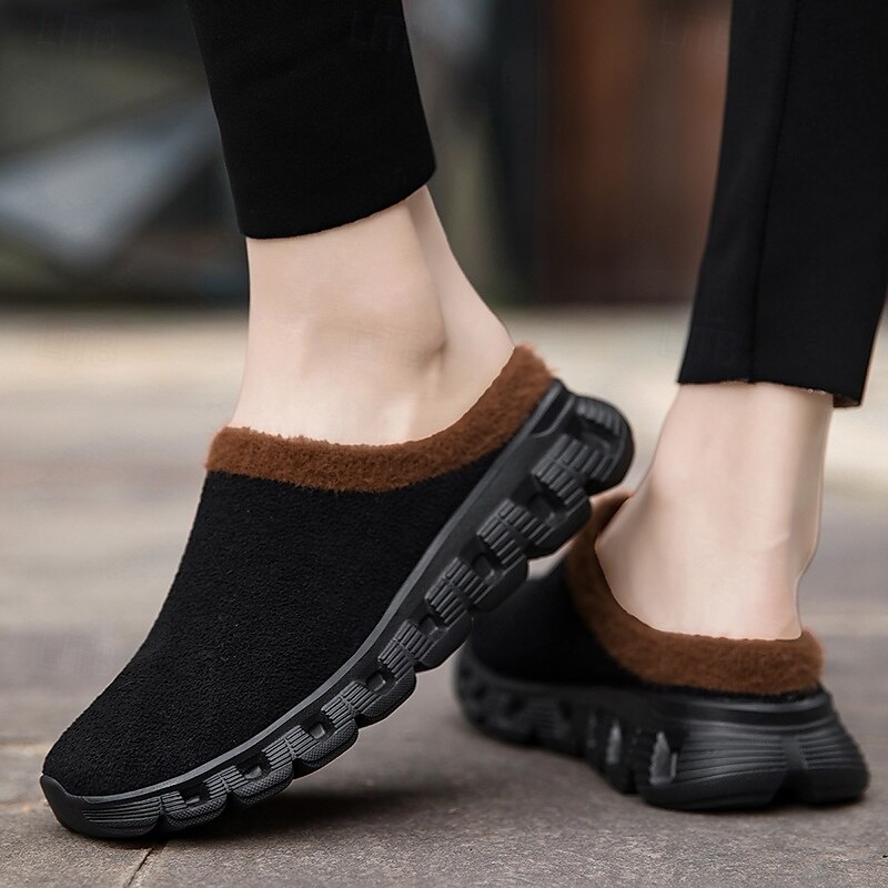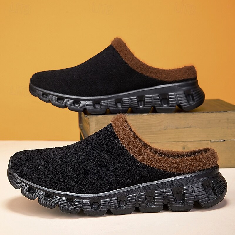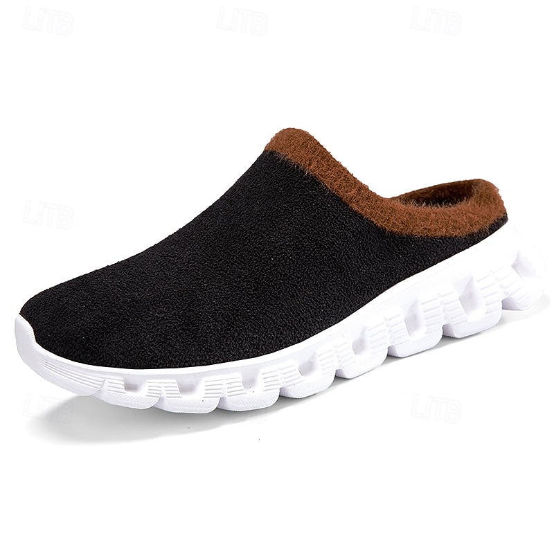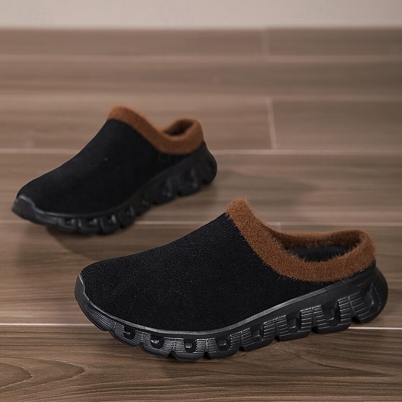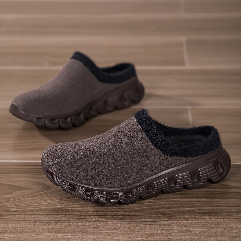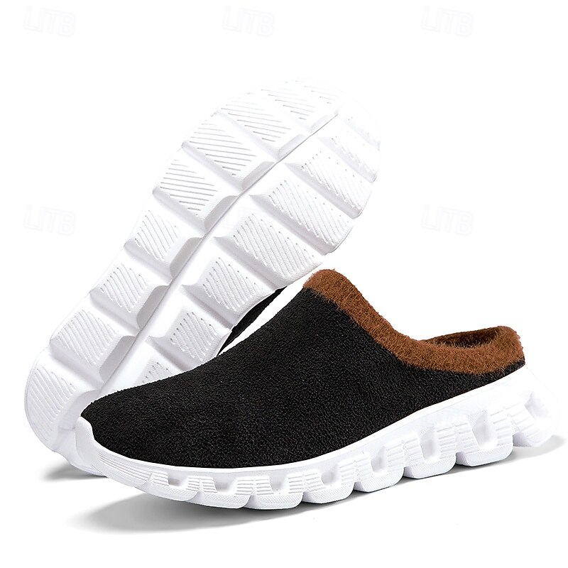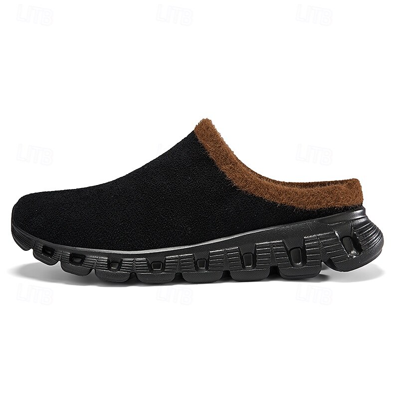 Highlights [Fabric & Construction] : Crafted with a luxurious suede upper, these men's clogs deliver both comfort and style. The inner lining is made from PU, offering a soft and warm fleece-like feel that is perfect for chilly weather. [Design & Fit] : Featuring a convenient slip-on loafer design, these clogs highlight a round toe shape that provides ample room for your toes. The shoe's structure pairs a plush fleece lining with a supportive outsole, ensuring all-day comfort and a secure fit. [Key Design Elements] : The outsole is made from durable rubber, designed with an anti-slip tread pattern that provides enhanced grip and stability, making these clogs suitable for a variety of surfaces. The chunky sole adds to both the stylish appearance and the cushioning effect, ideal for everyday wear. [Occasions] : These versatile clogs are perfect for both indoor and outdoor activities. Whether you're enjoying a relaxed day at home or running errands in colder weather, their neutral color palette makes them easy to match with any casual outfit. [Size Range] : Available in a wide range of sizes from US6-6.5 to US12, ensuring a comfortable fit for various foot sizes. With options in classic colors like Black, Purple, Coffee, and Black and White, these clogs can cater to different style preferences.