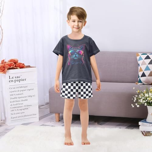 Checkerboard Plaid Cool Cat Sunglass Dark Pajama Set Short Sleeve Nightwear velvety Clothes Set Summer Pajamas Cotton 5Y