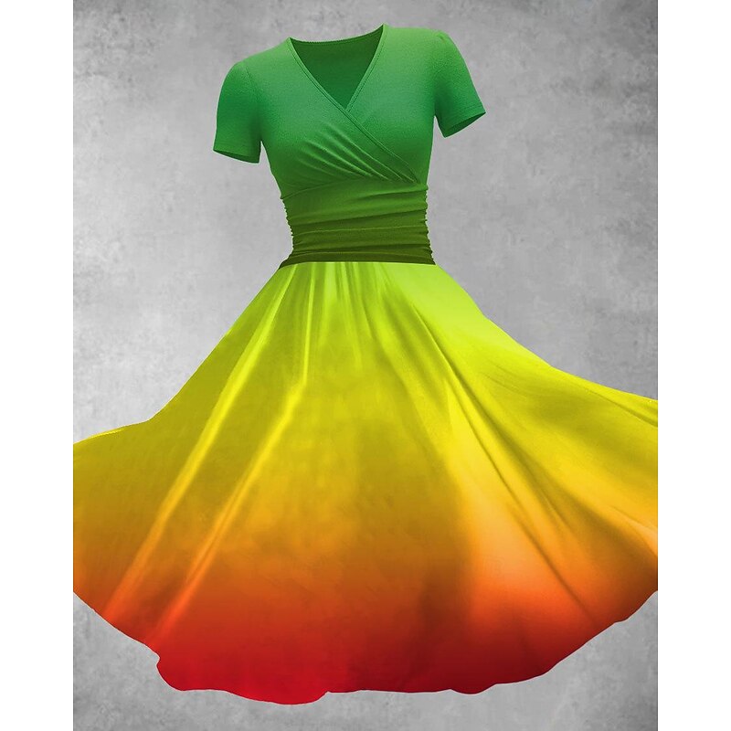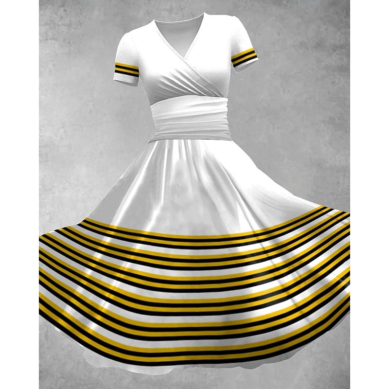 Featuring a classic cross-over V-neck with a sleek, elegant silhouette, this swing dress boasts an A-line flare cut that adds a touch of sophistication. The short sleeves offer a simple yet refined design, effortlessly enhancing the overall appeal of the dress.