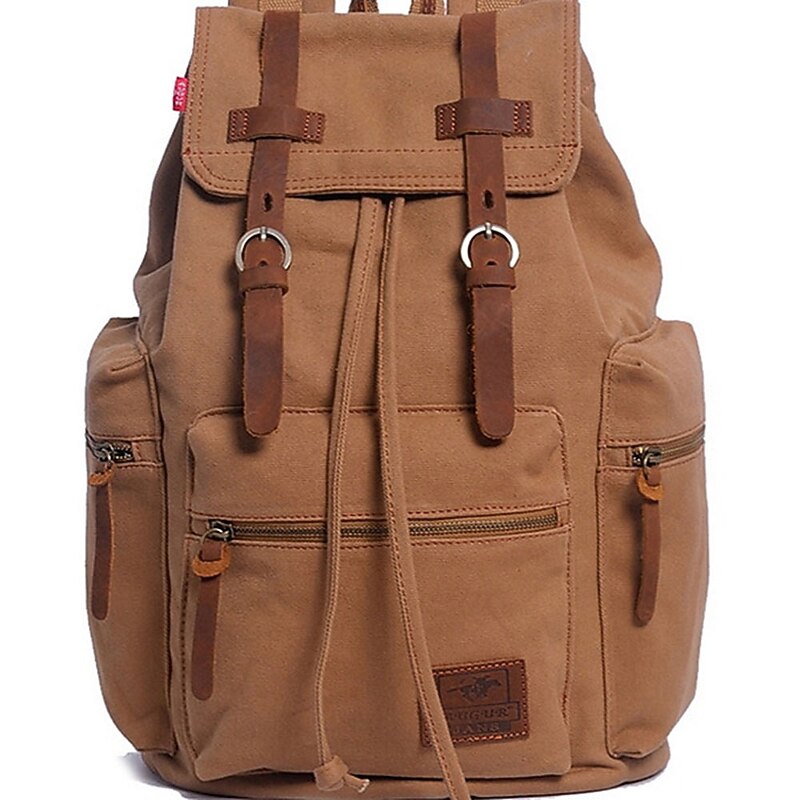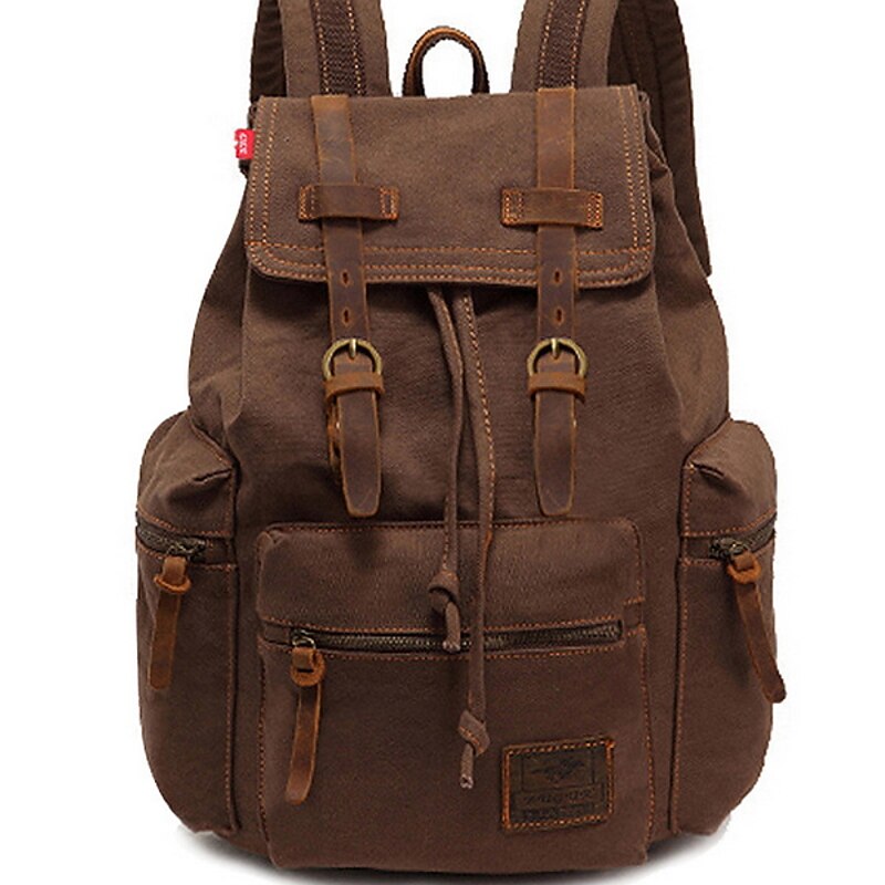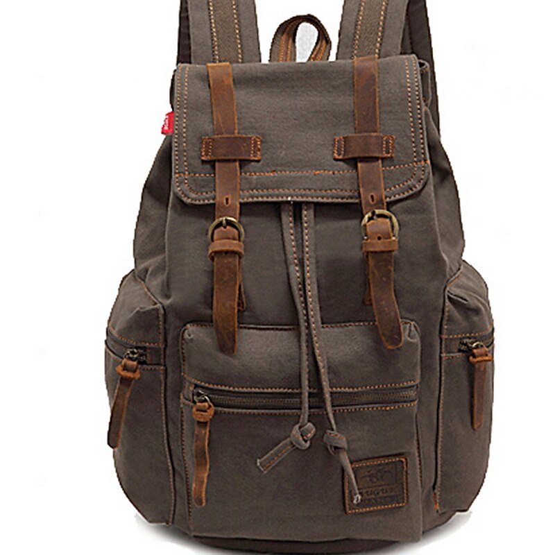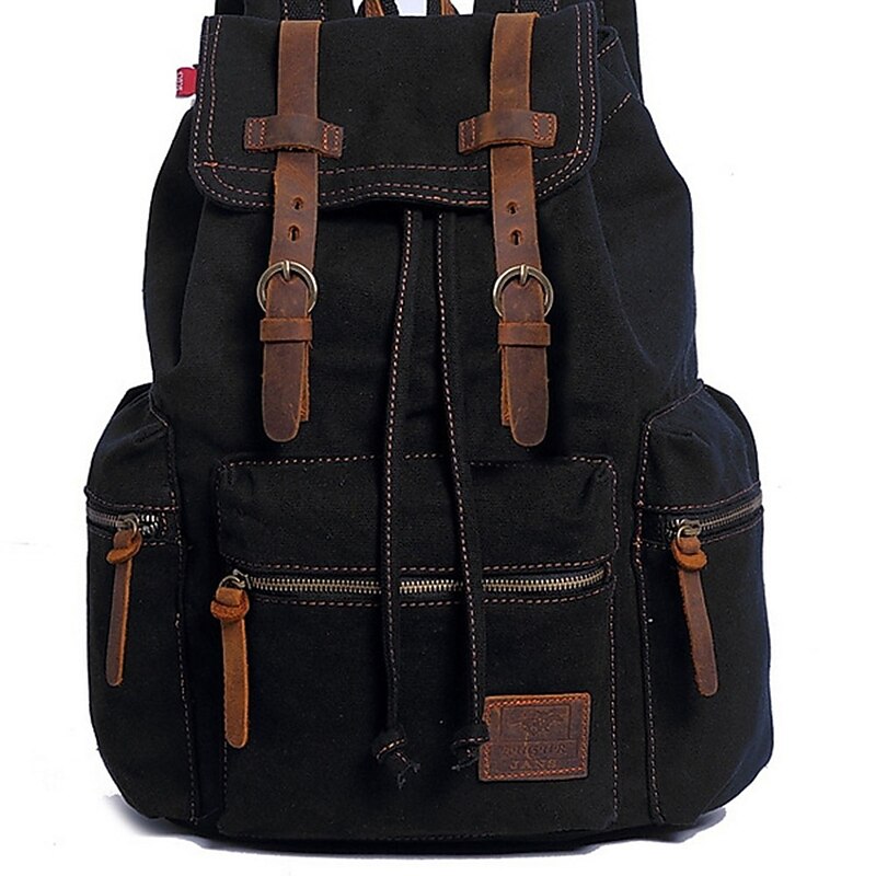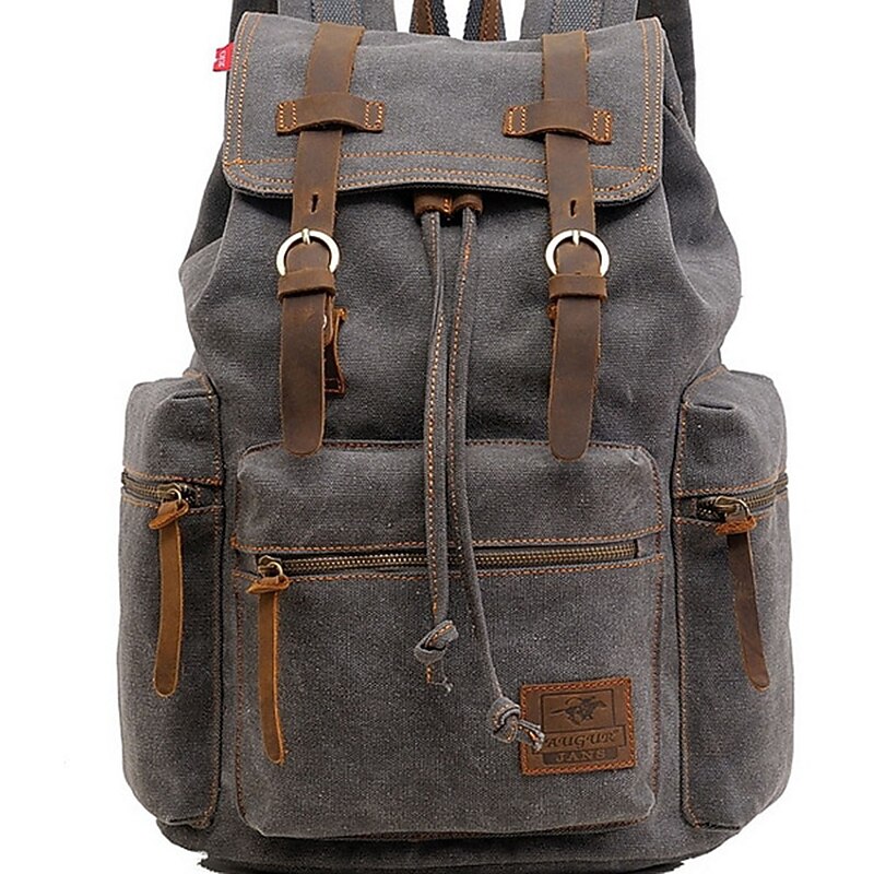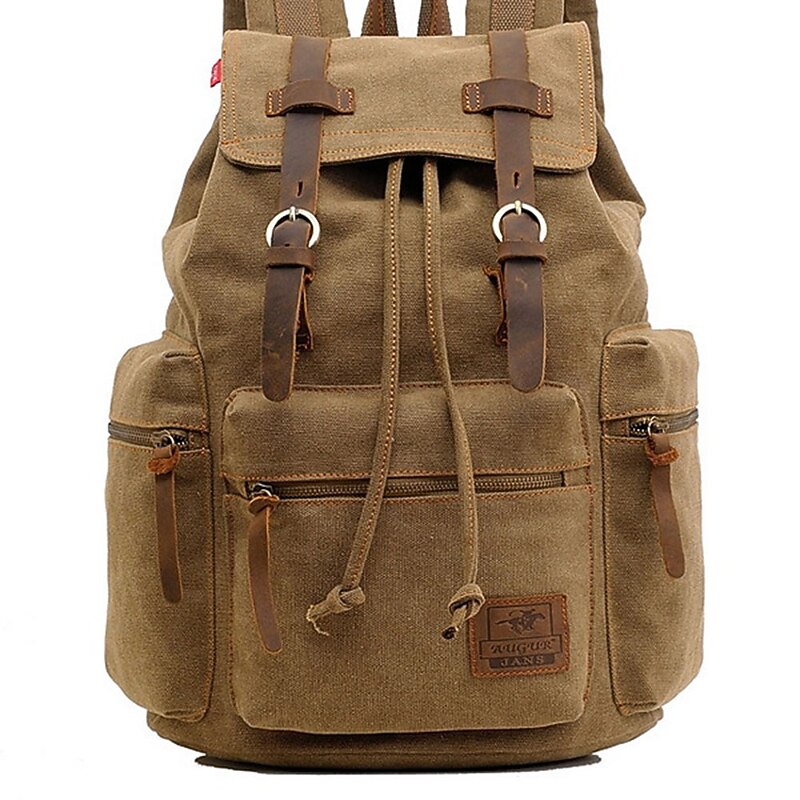 HOT ! Men's Vintage Canvas Backpack with Leather Straps and Drawstring Closure – Durable Travel Rucksack for Hiking, School, or Daily Use
