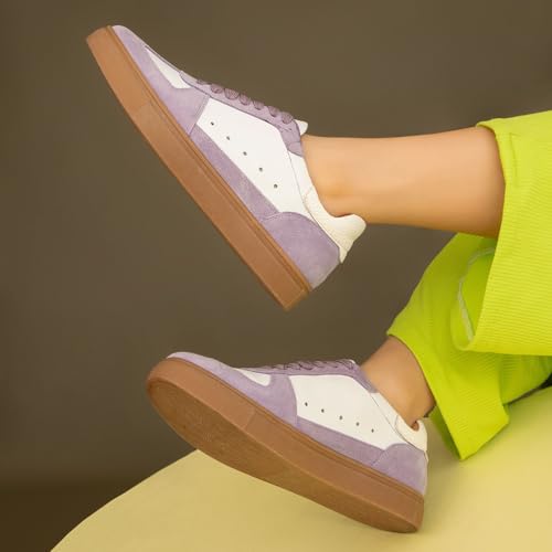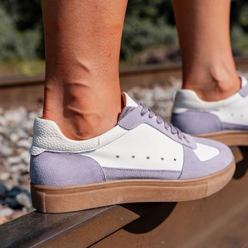 • DESIGN: Stylish color block sneakers featuring premium suede leather construction with contrasting white panels and gum rubber sole