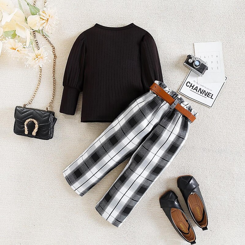 More information about Girls' 3D Solid Color Plaid T-shirt & Pants Set Long Sleeve Summer Casual Street Style Toddler 1-5 Years Crew Neck Outdoor Loose Fit