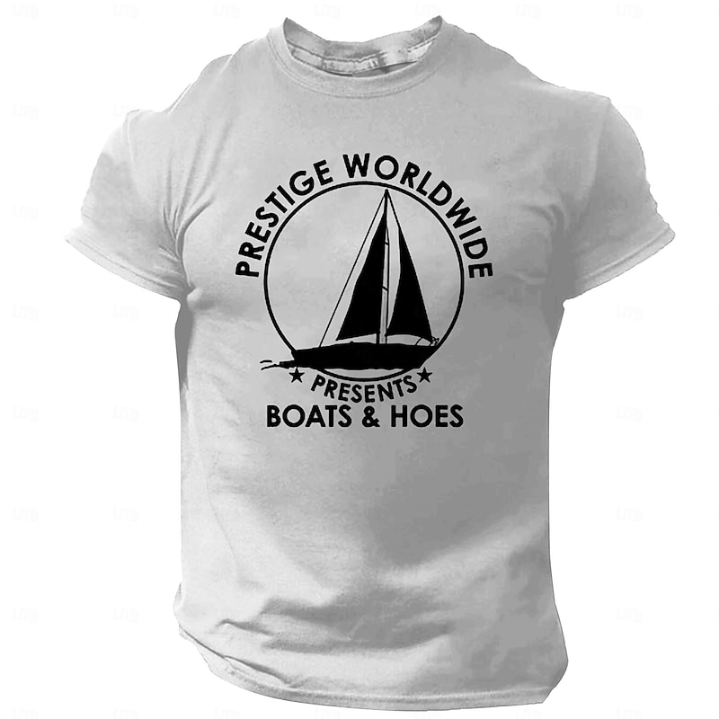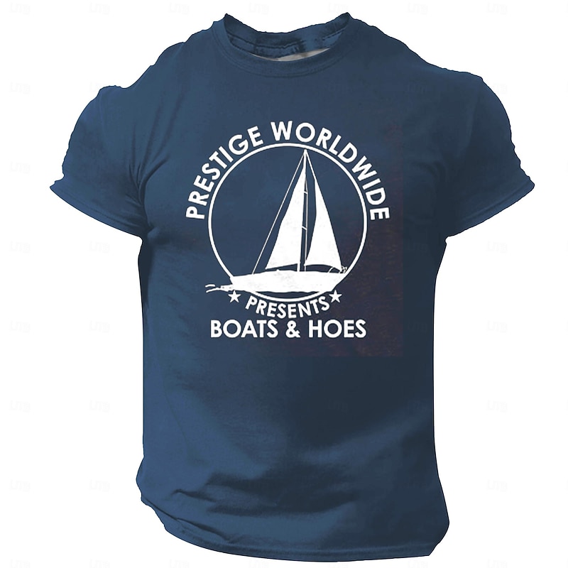 : Featuring a bold, humorous graphic print of a stylized sailboat with the text "Prestige Worldwide Presents Boats & Hoes," this T-shirt adds a playful and vintage touch to your wardrobe. The use of 3D printing techniques enhances the vividness of the design, making it a standout piece.