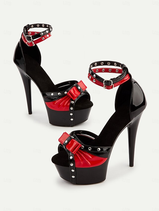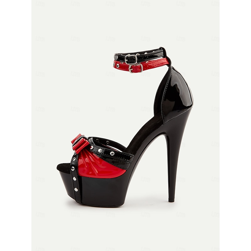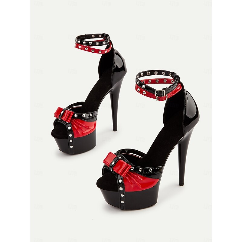 HOT ! Women's 1980s Gothic Platform Stiletto Heels – Black and Red Peep-Toe High Heels with Studded Straps and Bow Detail for Clubwear, Parties, and Cosplay