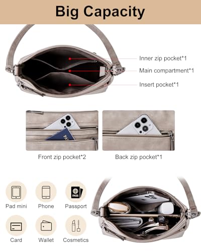 • Storage Capacity: Crossbody purse have a main compartment, two front zipper pockets, one back zipper pocket, two inner open pockets. Stylish crossbody bag offers enough room for daily essentials like a phone, ipad mini, kindle, wallet, keys, cash, ID card, cosmetics and so on, say goodbye to digging through your purse for items, all in good order