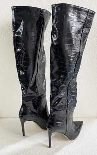 More information about Frankie Hsu Fashion Designer Sexy Women Big Large Size Black Faux Fur Lined Crocodile Patent Leather Stiletto Knee High Heeled Calf Long Boots US4-14