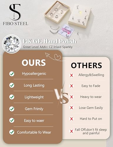 • Hypoallergenic gold/silver flat back earrings with luxury finish: Surgical steel earrings feature 0.03μm 14k gold plating over copper base, screw-back secure design and aaa+ zirconia inlays. Waterproof & nickel-free flatback studs ideal for sensitive ears