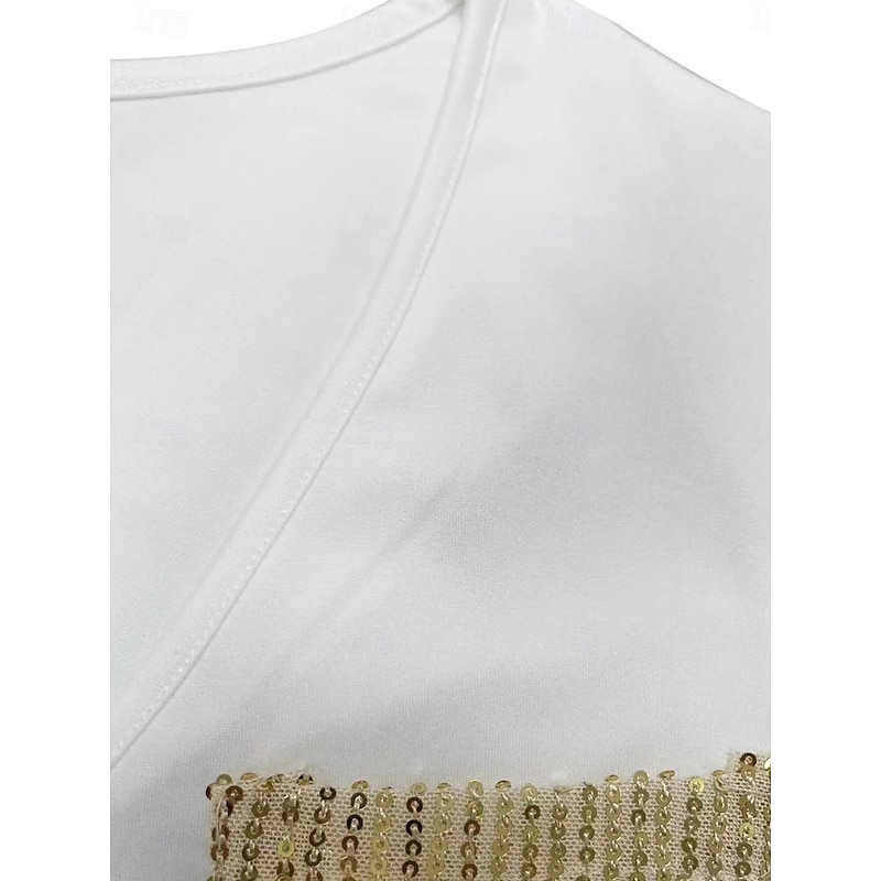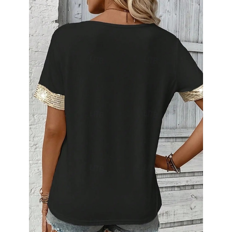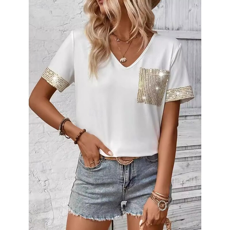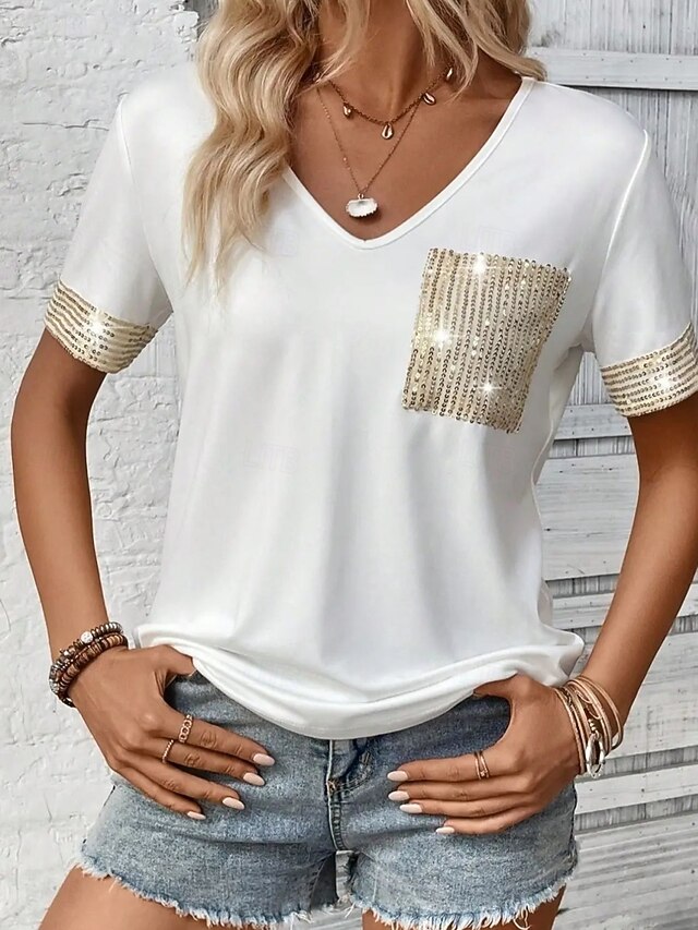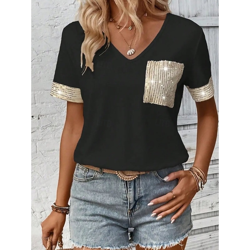 More information about Women's Blouse Solid Color Basic Casual Short Sleeve V Neck Regular Tops Daily Sequins Patchwork Pocket Black White Summer Spring