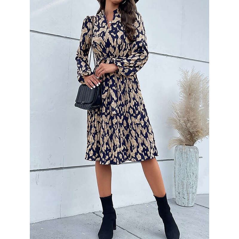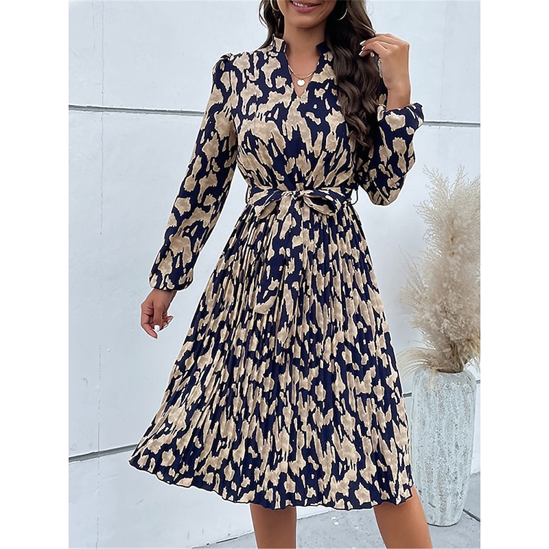 Highlights [Fabric] : Crafted from high-quality polyester, this dress features a micro-elastic material that provides both comfort and a flattering drape. The lightweight fabric allows for a breathable wear perfect for transitioning seasons. [Silhouette] : Designed with a classic A-line silhouette, this midi dress offers a versatile fit that flatters various body types. The regular fit style ensures it drapes elegantly without feeling restrictive. [Design Highlights] : The dress showcases a modern floral print that adds a touch of sophistication, while the V-neckline offers a modestly stylish appearance suitable for any occasion. Long sleeves with subtle gathering at the shoulders enhance elegance, and a matching fabric tie belt cinches the waist to accentuate a feminine shape. [Occasions] : Ideal for daily wear in spring and fall, this dress effortlessly transitions from casual day outings to more formal evening gatherings. Pair it with different accessories to suit the mood and occasion, whether relaxed weekends or elegant soirées. [Size Range] : Available in sizes S, M, L, and XL, catering to a wide range of body shapes and preferences, ensuring everyone can find their perfect fit.