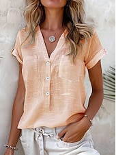 More information about Women's Shirt Cotton Linen Shirts Button Up Blouse Solid Color Basic Casual Short Sleeve V Neck Regular Tops Daily Pocket Black Pink Blue Orange Light Grey Summer Spring