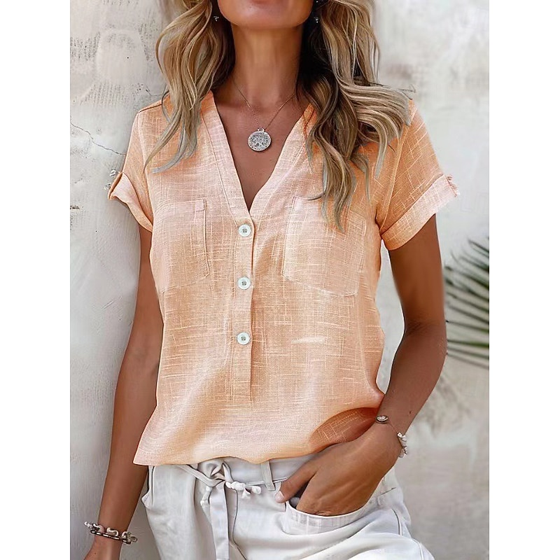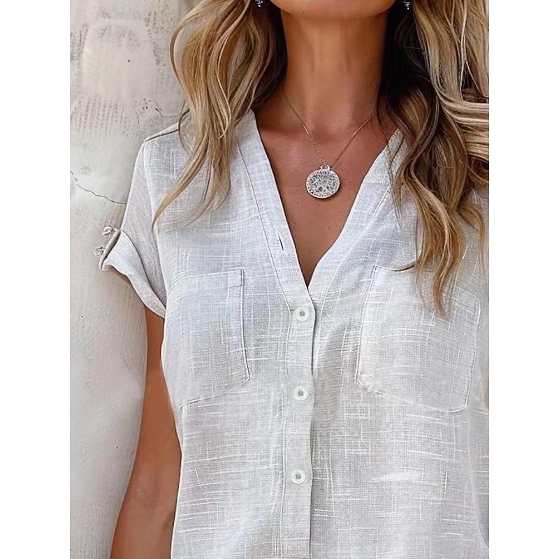 HOT ! Women's Shirt Cotton Linen Shirts Button Up Blouse Solid Color Basic Casual Short Sleeve V Neck Regular Tops Daily Pocket Black Pink Blue Orange Light Grey Summer Spring