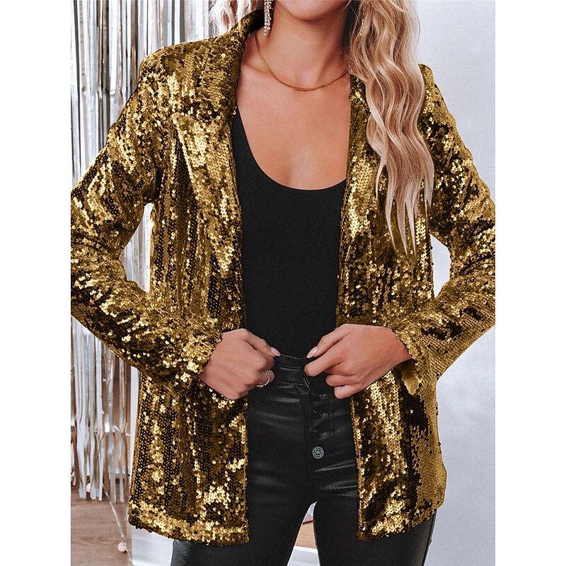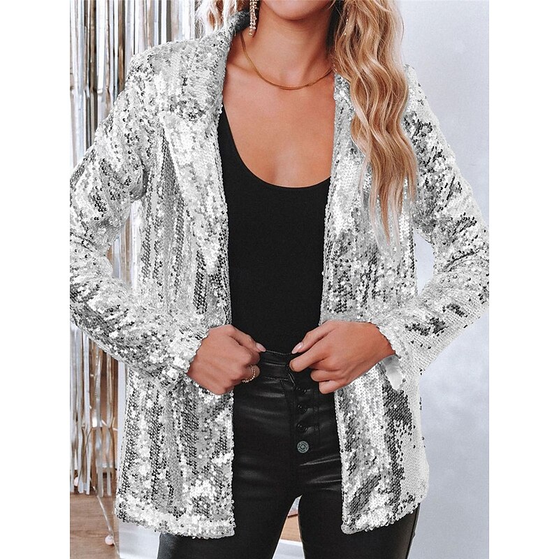 Highlights [Fabric]: Crafted from high-quality polyester, this women’s winter jacket offers a micro-elastic fit, providing comfort and warmth during the colder months. The thermal and breathable fabric ensures practicality without sacrificing style. [Fit]: The jacket is designed with a regular fit, making it an ideal addition to any wardrobe. Its classic tailored silhouette flatters various body types, offering both comfort and sophistication. [Design Highlights]: This stylish casual jacket features a dazzling all-over sequin design in gold, silver, or red. The open front adds a contemporary touch, while the notched turndown neckline enhances its elegant appeal. The jacket also boasts long sleeves for added warmth and style. [Occasions]: Perfect for daily wear, street fashion, parties, and outdoor events. Whether you're heading to a festive gathering or a casual outing, this jacket adds a touch of glamour to any ensemble. [Sizes]: Available in a wide range of sizes from S to 2XL, catering to diverse preferences and ensuring a perfect fit for many.