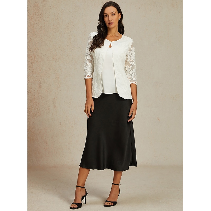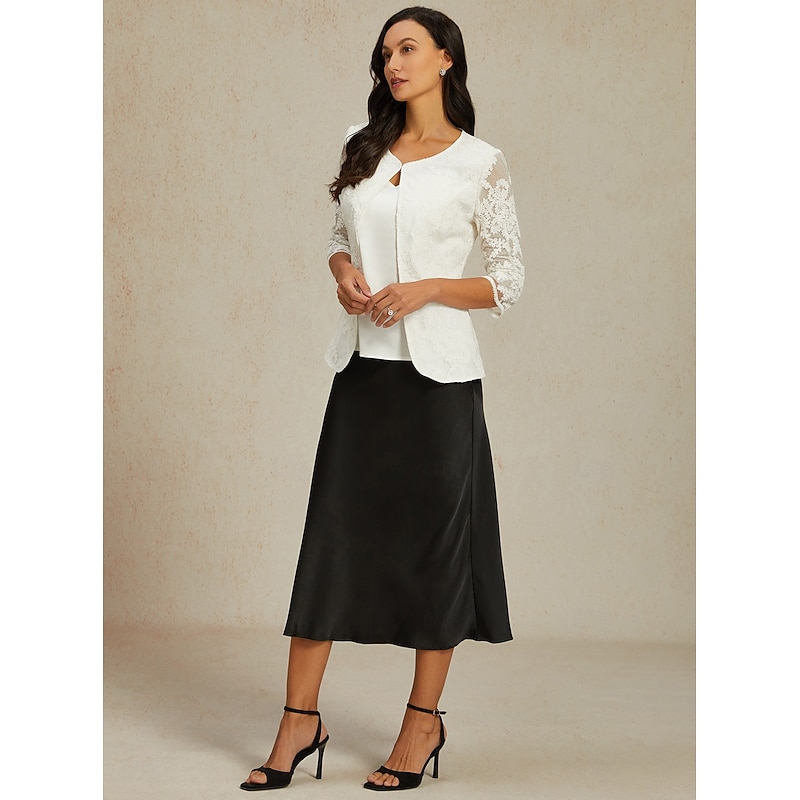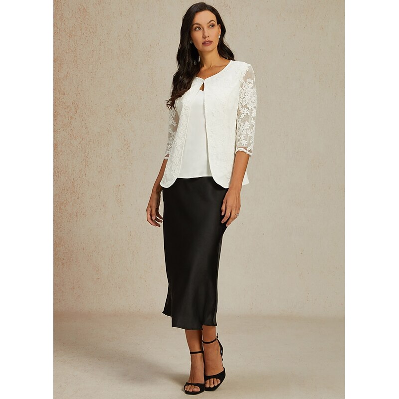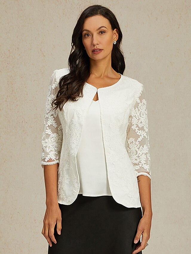 HOT ! Women's Lace Jacket Blazer Mesh Elegant 3/4 Length Sleeve Crew Neck Regular Tops Wedding Guest Work Daily Lace White Spring Fall