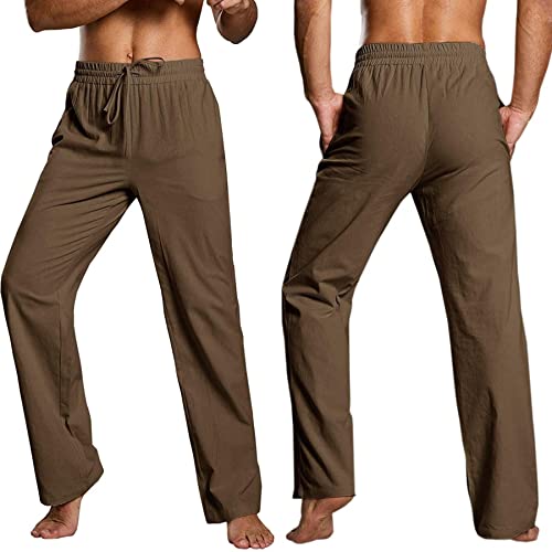 HOT ! Enjoybuy Men's Linen Drawstring Beach Golf Elastic Waist Spring Long Casual Loose Summer Yoga Cotton Pants, 02-brown, Large