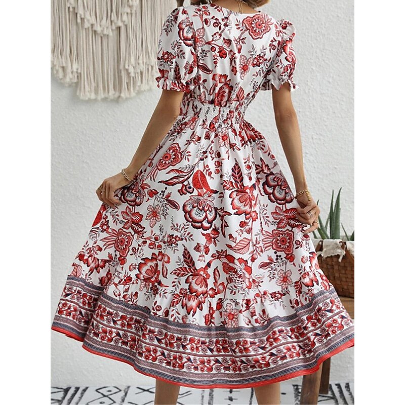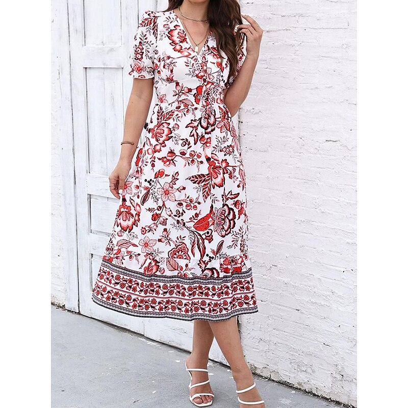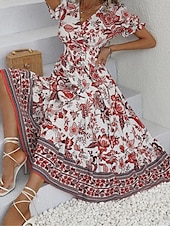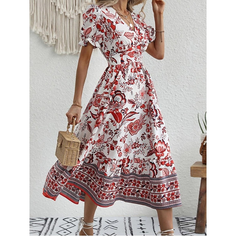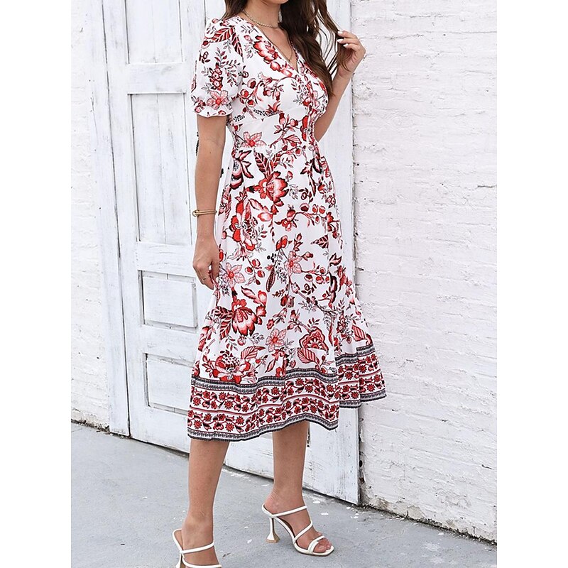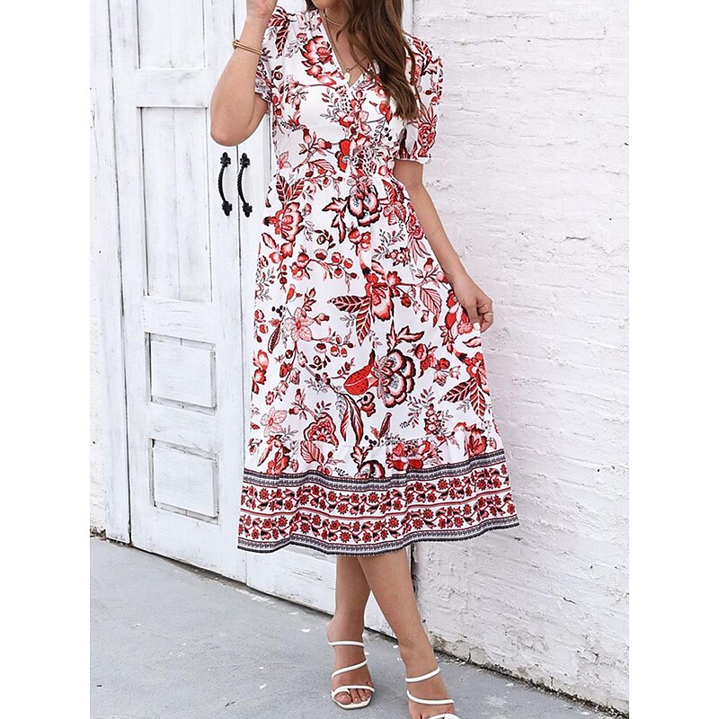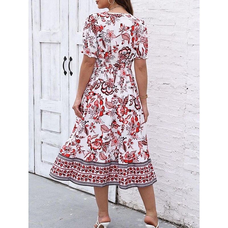 Women's Midi Dress Casual Dress Swing Dress A Line Dress Summer Dress Streetwear A Line Vacation Street Holiday Regular Fit Floral Short Sleeve V Neck Black Red Blue Green Summer