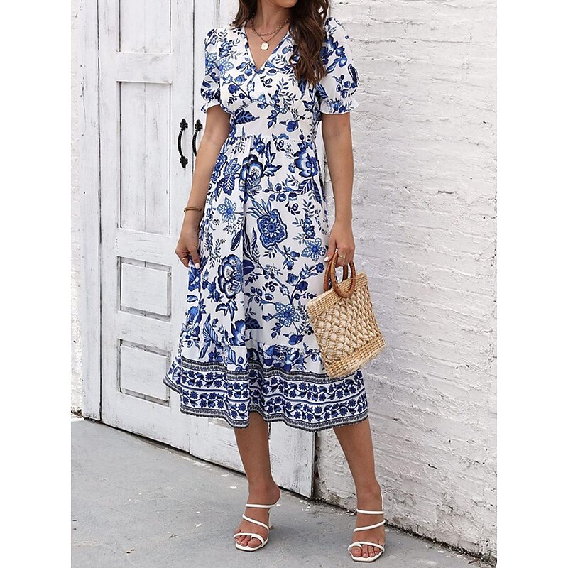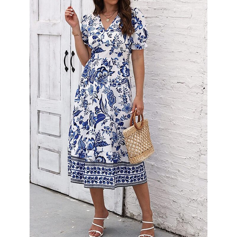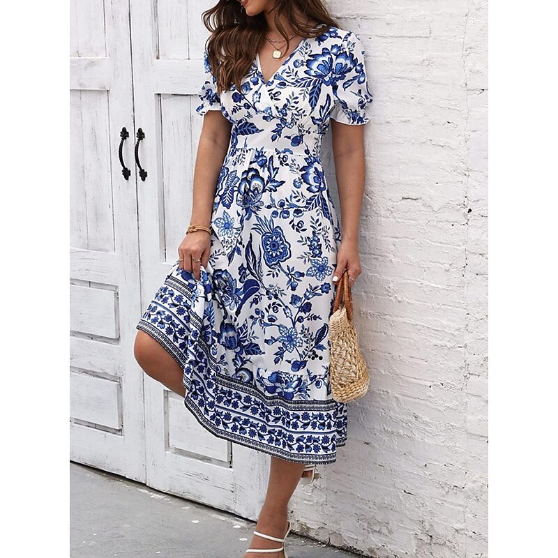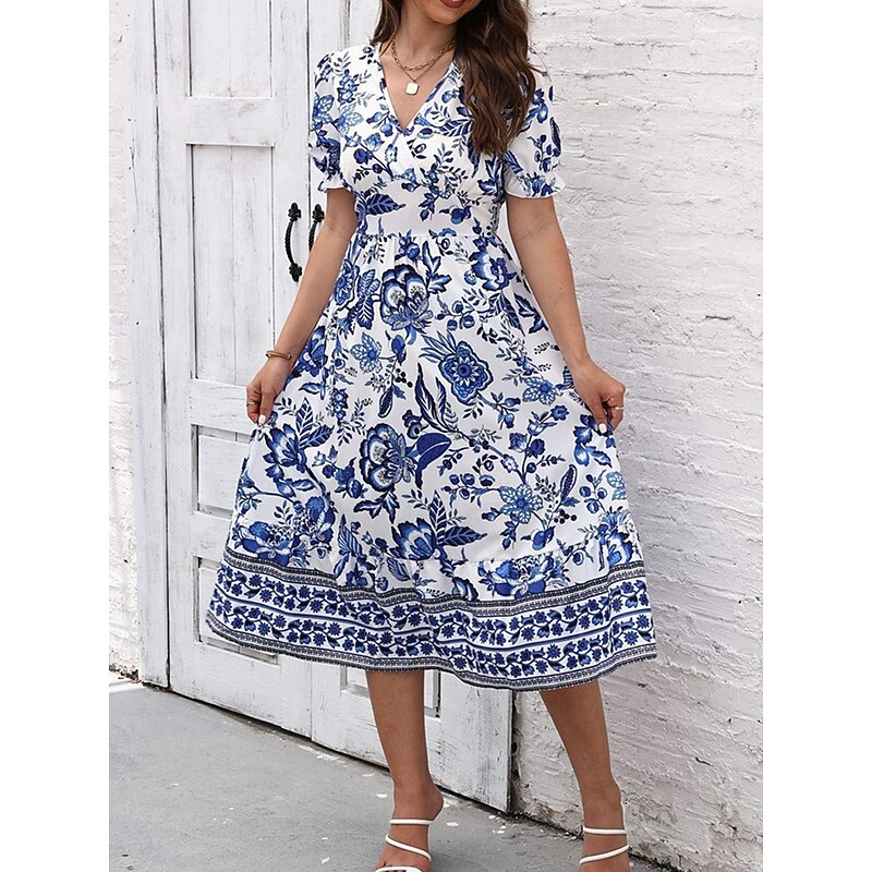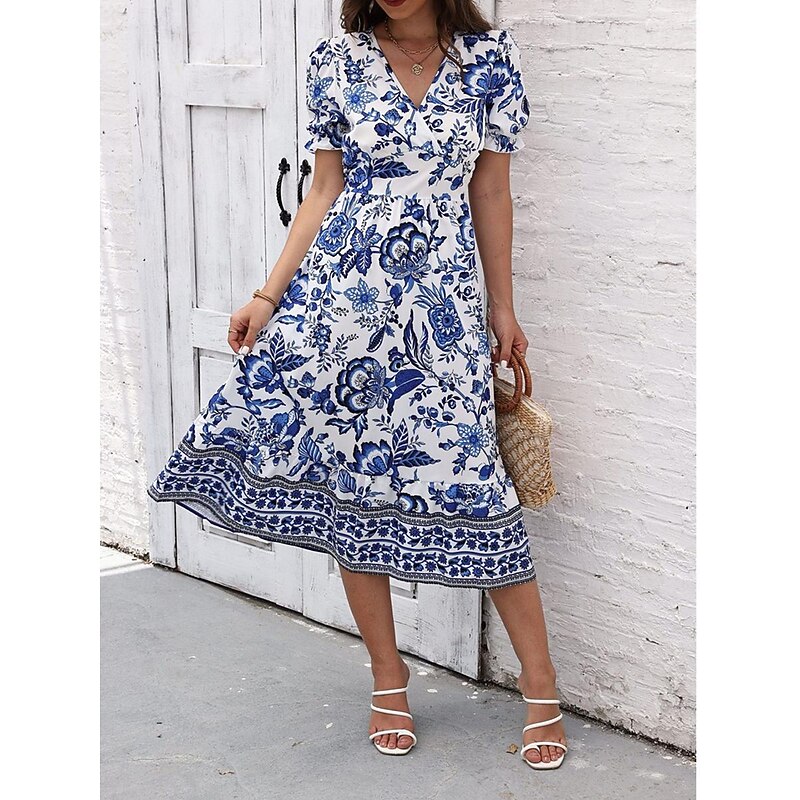 Highlights [Fabric and Material] : Crafted from high-quality polyester, this dress offers a lightweight and breathable feel perfect for summer wear. The micro-elastic property enhances comfort and ensures a comfortable fit. [Silhouette and Fit] : Designed in a flattering A-line silhouette, this midi dress provides a regular fit that complements various body types. The wrap style with a V-neckline accentuates the waistline, creating a feminine and elegant appearance. [Design Highlights] : Featuring a vivid floral print, the dress showcases a vibrant blue and white pattern. The intricate border details add a touch of sophistication, while the puff sleeves offer a trendy and sophisticated look. [Occasions] : Ideal for vacations, street outings, and holiday events, this dress seamlessly transitions from casual to chic. Whether you're exploring a new city or attending a summer gathering, it adds charm and elegance to any occasion. [Size Range] : Available in a range of sizes from S to 2XL, catering to a variety of body shapes and ensuring a perfect fit for everyone. Perfect for everyday use. first-class materials and excellent craftsmanship ensure long-lasting durability.
