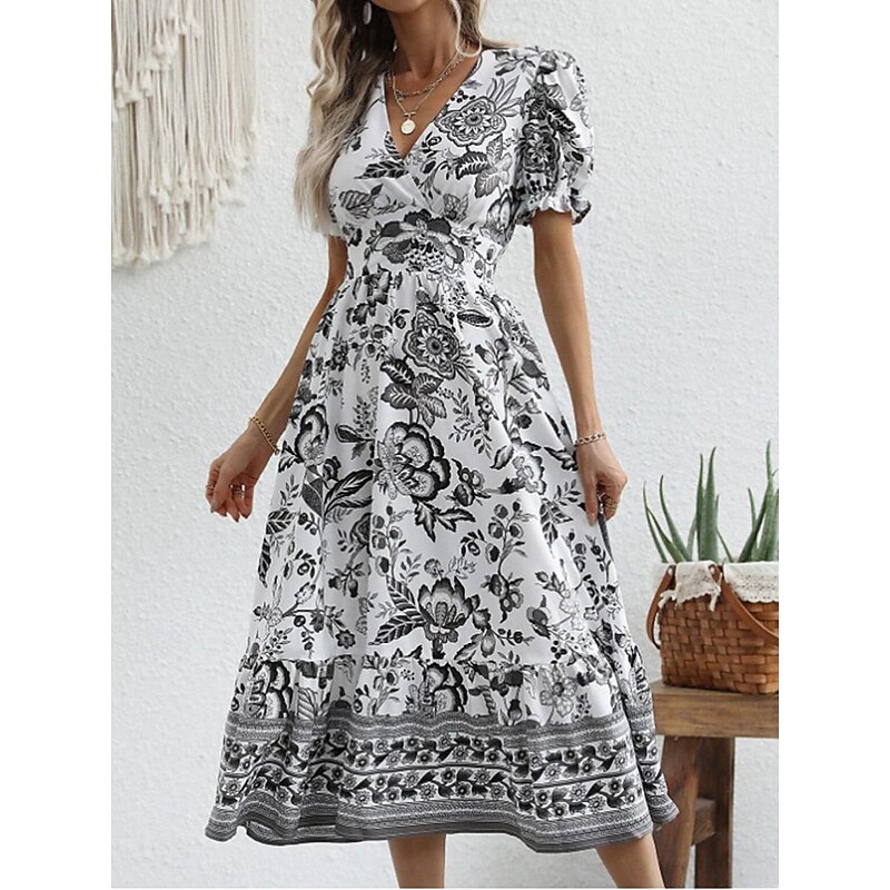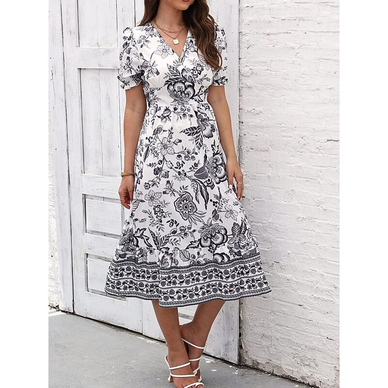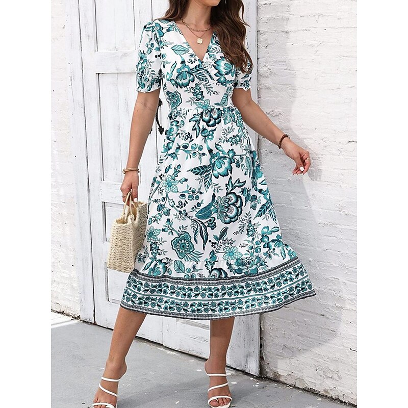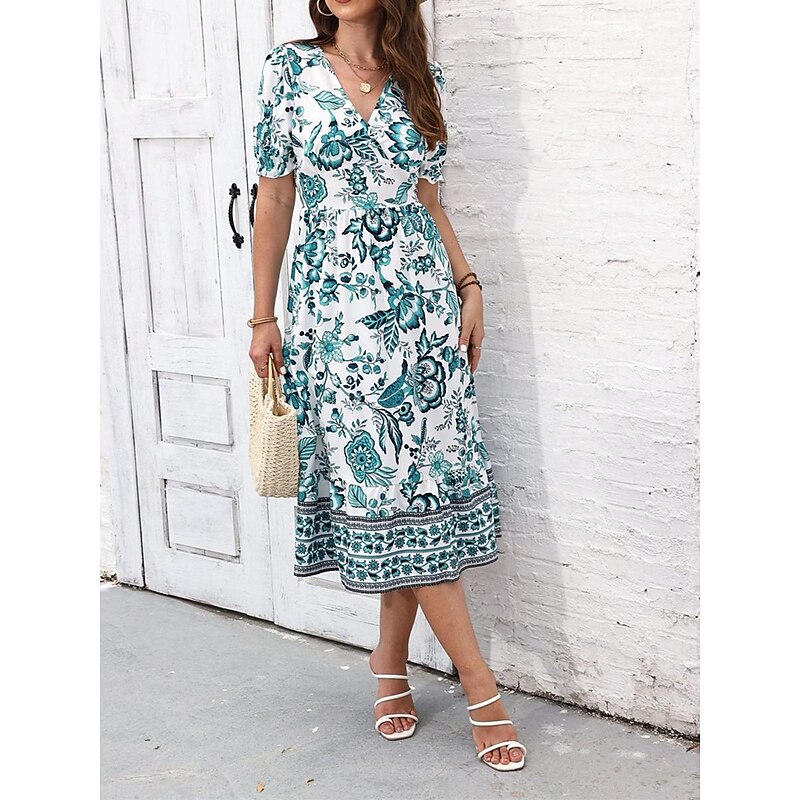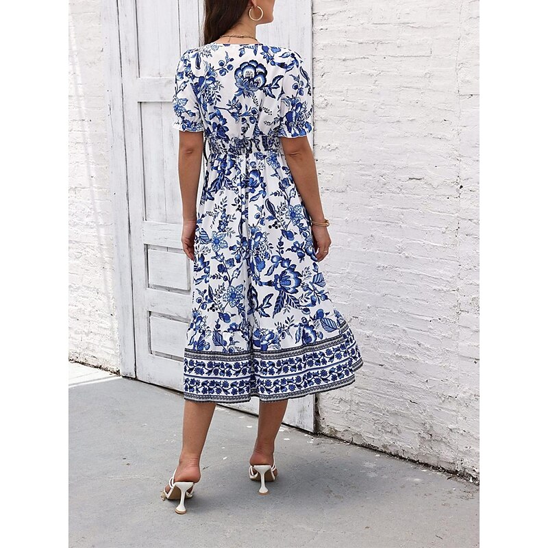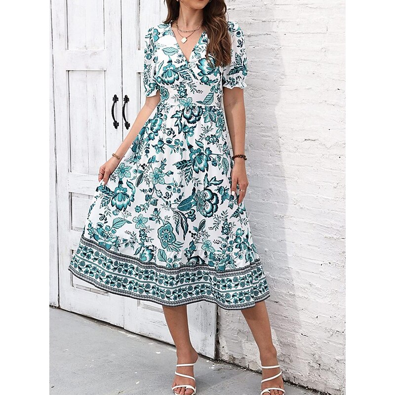 Highlights [Fabric and Material] : Crafted from high-quality polyester, this dress offers a lightweight and breathable feel perfect for summer wear. The micro-elastic property enhances comfort and ensures a comfortable fit. [Silhouette and Fit] : Designed in a flattering A-line silhouette, this midi dress provides a regular fit that complements various body types. The wrap style with a V-neckline accentuates the waistline, creating a feminine and elegant appearance. [Design Highlights] : Featuring a vivid floral print, the dress showcases a vibrant blue and white pattern. The intricate border details add a touch of sophistication, while the puff sleeves offer a trendy and sophisticated look. [Occasions] : Ideal for vacations, street outings, and holiday events, this dress seamlessly transitions from casual to chic. Whether you're exploring a new city or attending a summer gathering, it adds charm and elegance to any occasion. [Size Range] : Available in a range of sizes from S to 2XL, catering to a variety of body shapes and ensuring a perfect fit for everyone. Perfect for everyday use. first-class materials and excellent craftsmanship ensure long-lasting durability.