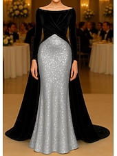 More information about Black and Gold A-Line Mermaid / Trumpet Stretch Velvet Evening Gown Elegant Dress Formal Wedding Sweep / Brush Train Long Sleeve Boat Neck Sequined with Ruched 2025