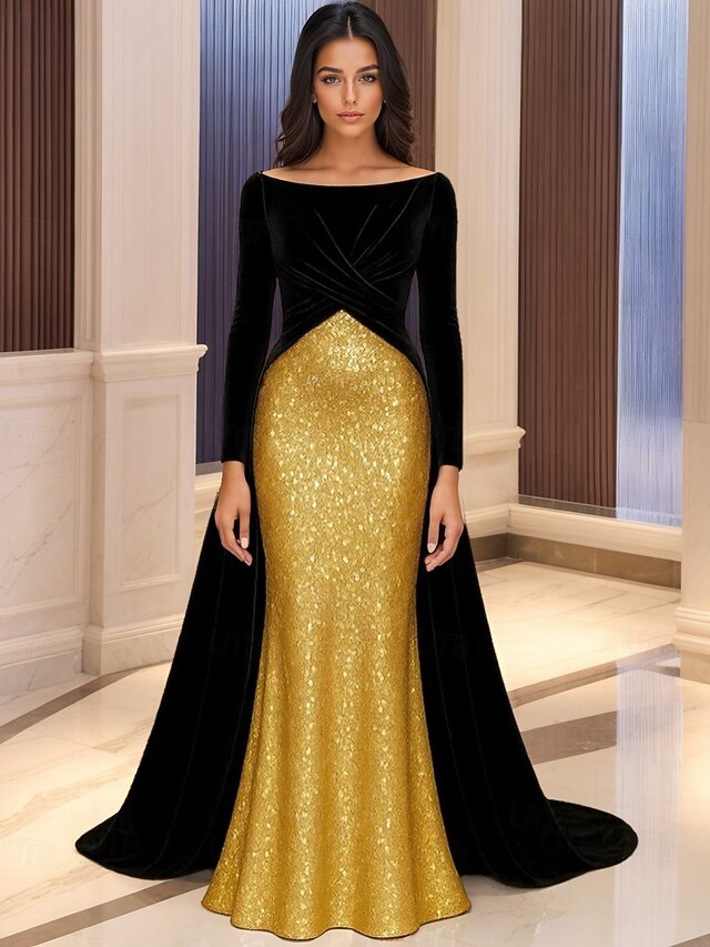 HOT ! Black and Gold A-Line Mermaid / Trumpet Stretch Velvet Evening Gown Elegant Dress Formal Wedding Sweep / Brush Train Long Sleeve Boat Neck Sequined with Ruched 2025