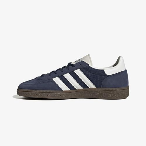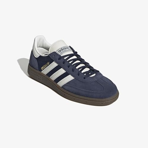 • CLASSIC DESIGN: Iconic Adidas Handball Spezial sneaker featuring navy suede and textile upper with signature white stripes and gum rubber sole