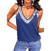 Highlights [Fabric] : Crafted from high-quality polyester, this women’s sleeveless top offers a lightweight and flowy feel, providing comfort and breathability. The micro-elasticity of the fabric ensures a relaxed yet flattering fit that is perfect for various occasions. [Fit] : The tank top features a regular fit that accentuates the figure pleasantly without being overly tight, making it easy to wear for both casual and more refined events. [Design Highlights] : Boasting a deep V-neckline, this top is adorned with decorative lace trim, adding a touch of sophistication. The sparkly sequins throughout create a striking metallic effect, perfect for grabbing attention at any event. [Occasions] : Ideal for holidays, parties, and weekend outings, this versatile top seamlessly transitions from casual streetwear to chic evening attire. Pair it with jeans or skirts to suit any style preference. [Size Range] : Available in sizes S, M, L, XL, and 2XL, this top provides a range of options to fit different body types, ensuring every woman can find her perfect fit.
