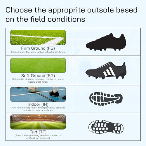 • NON-SLIP TPU STUDS FOR SAFETY & TRACTION: Stay worry-free! Our cleats feature a non-slip TPU outsole that gives excellent traction on grass and turf, minimizing slips and falls during practice or play. Parents trust Vizari for stable, safe footing.