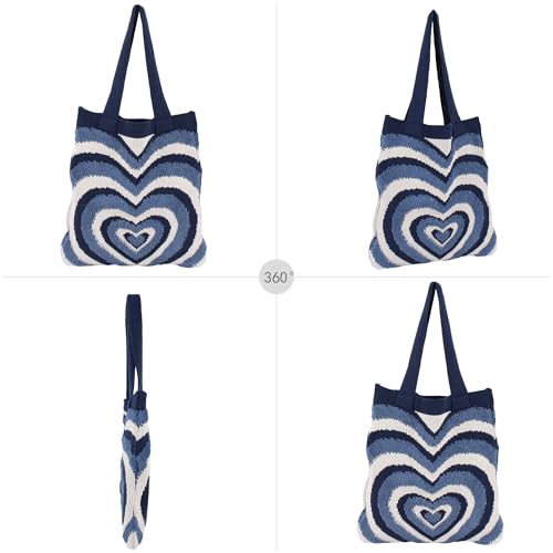 ZLM BAG US Women Crochet Shoulder Handbag Open Top Tote Bag Knitted Heart Stripe Hobo Purse Handmade Shopper Grocery Bag 4