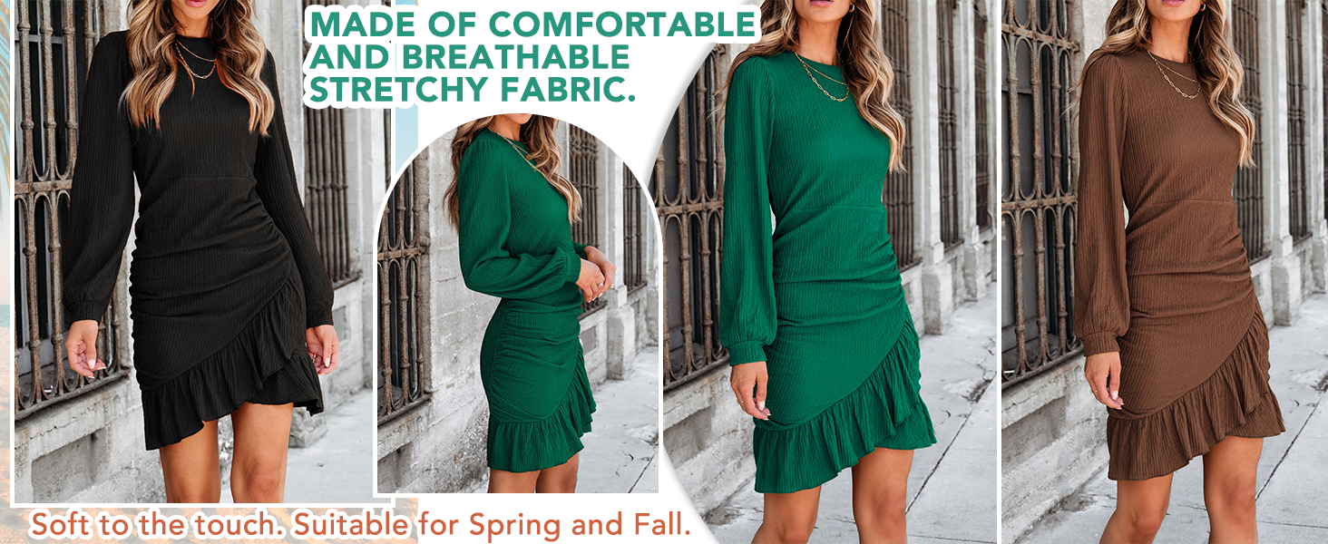 R.Vivimos Fall Elegant Dresses for Women Long Sleeve Crewneck Trendy Ruched Ruffle Hem Spring Casual Mini Dress