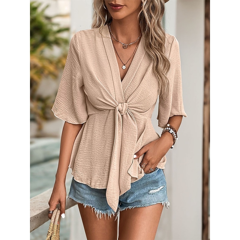 More information about Women's Shirt Blouse Solid Color Stylish Casual Half Sleeve V Neck Regular Tops Daily Tie Front Khaki Summer Spring