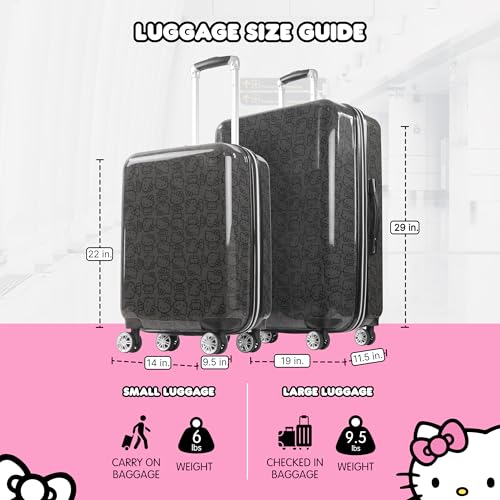 • HELLO KITTY TRAVEL LUGGAGE SET: 22 and 30 inch hardshell luggage set featuring an entire over Hello Kitty pattern; small hardshell luggage carrier meets highly airline requirements for carry-on luggage and fits into most overhead bins, the large suitcases is intended as checked baggage for airlines