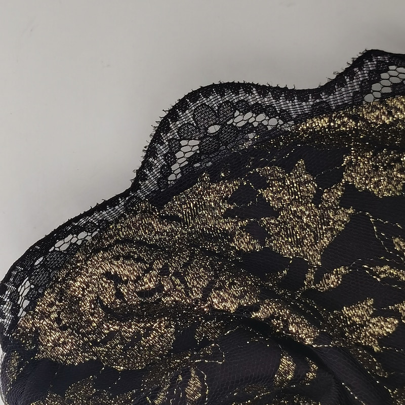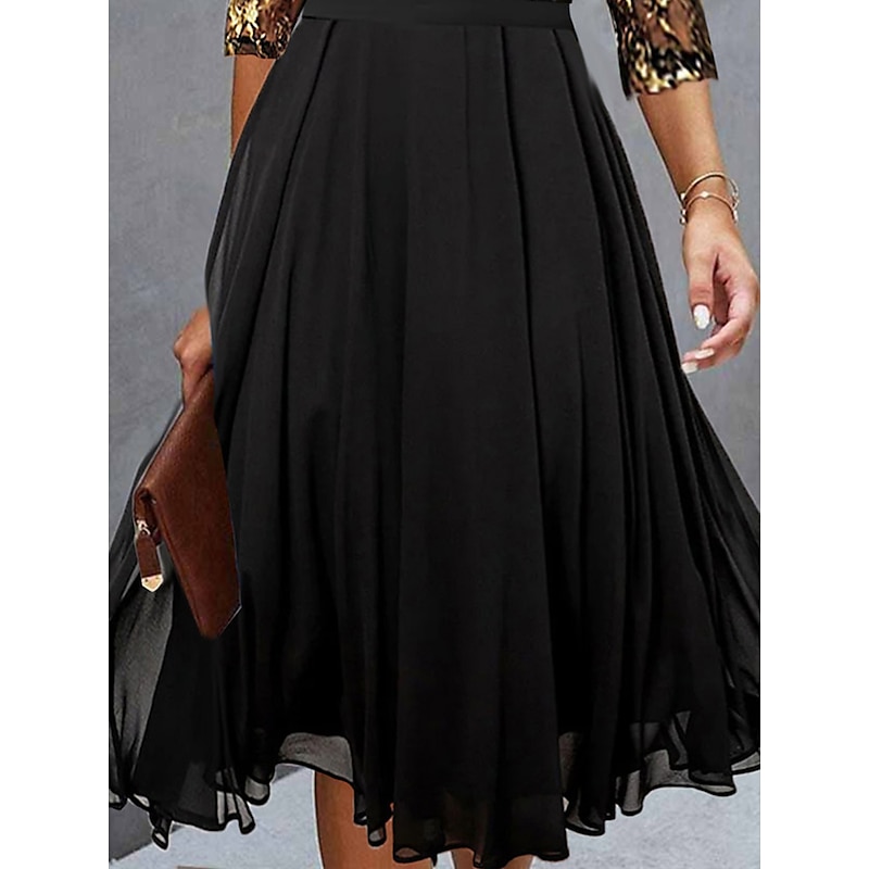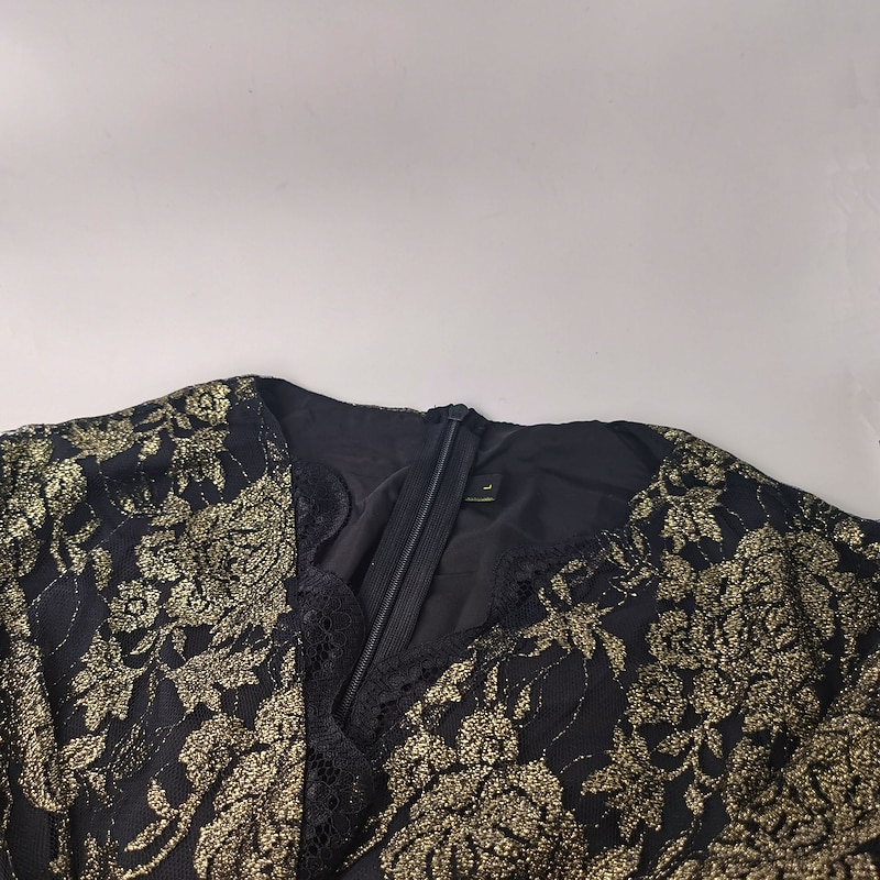 Highlights [Fabric] : Crafted from a blend of chiffon and delicate lace, this dress offers a luxurious feel and elegant appearance. The lace details feature a beautiful black and gold floral pattern, adding a sophisticated and ornate touch. [Silhouette] : Designed with a classic A-line silhouette, this dress provides a flattering fit that accentuates the figure while allowing comfortable movement. The flowing chiffon skirt enhances the dress's graceful drape and fluidity. [Design Highlights] : This dress boasts intricate lace detailing on the bodice and sheer three-quarter-length lace sleeves, adding femininity and elegance. The V-neckline and patchwork lace design contribute to its modern and stylish look. [Occasions] : Ideal for cocktail parties, formal events, vacations, tea parties, and as a wedding guest outfit, this dress is suitable for a variety of formal occasions. It is perfect for making a memorable impression at any special event. [Sizes] : Available in a range of sizes from S to 3XL, this dress caters to various body types, ensuring a comfortable and regular fit.
