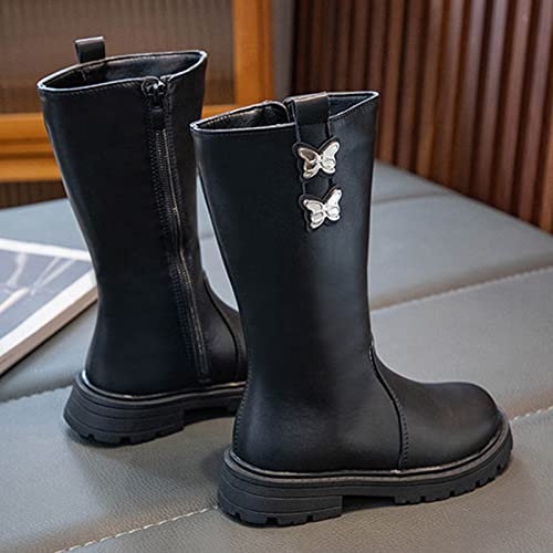 Girls Mid Calf Riding Boots PU Leather Solid Zipper Waterproof Rain Shoes Punk Goth Lug Sole Knee High Riding Boots 6