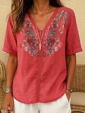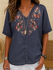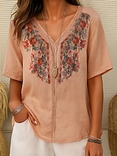 More information about Women's Cotton Linen Shirt embroidery Plants Elegant Vintage Fashion Short Sleeve V Neck Regular Tops Daily Going out Weekend Embroidered Red Navy Blue Light Brown Summer Spring