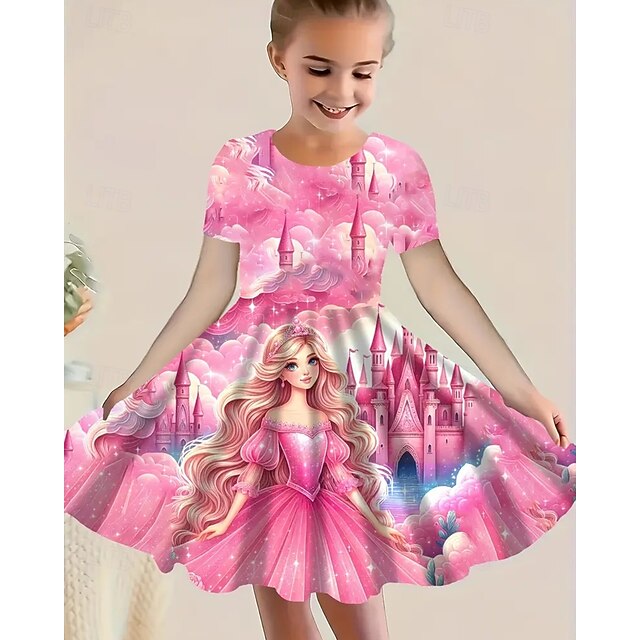 Girls' 3D Cartoon Dress Short Sleeve Summer Spring Vacation Daily Holiday Princess Beautiful Sweet Kids 4-12 Years Casual Dress A Line Dress Knee-length Regular Fit 3