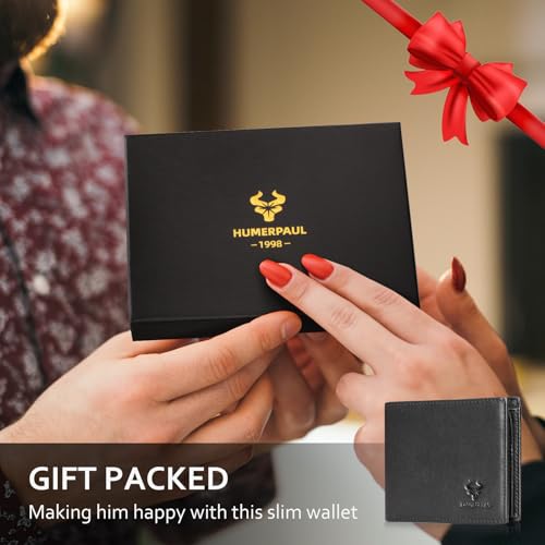 HOT ! Slim Men Wallets, RFID Blocking Genuine Leather Bifold Wallet Minimalist Front Pocket With ID Window (Black)
