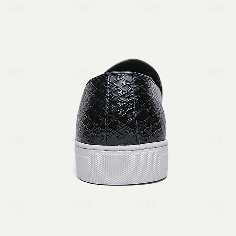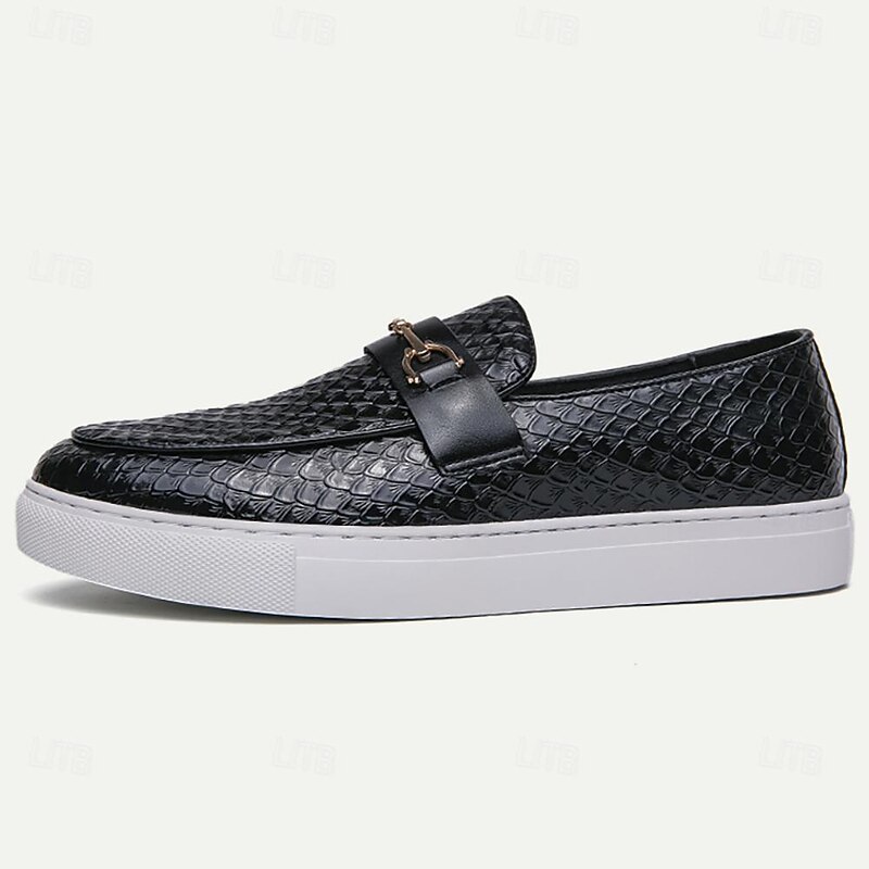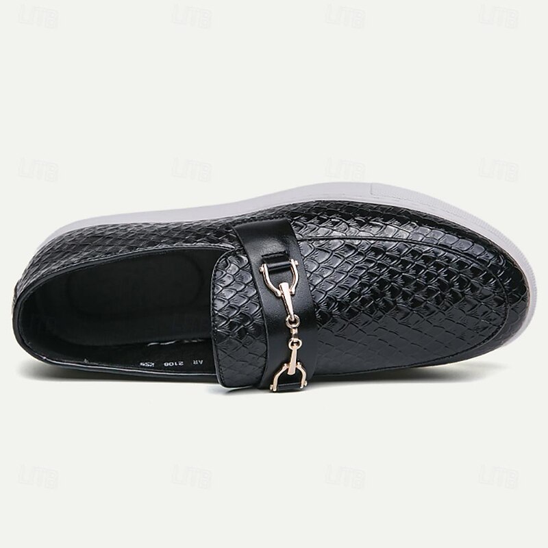 Highlights [Title] Men's Leather Slip-On Loafers - Stylish Embossed Dress Shoes with Metal Bit [Fabric] Crafted from high-quality PU leather, these loafers feature a distinctive snake-skin embossed texture that adds a sophisticated and luxurious flair. The lining is also made from PU for a comfortable fit. [Style] These loafers offer a sleek, slip-on design that provides both convenience and comfort. The classic round toe shape ensures a relaxed fit suitable for daily activities. [Design Highlights] A striking feature of these loafers is the decorative metal bit across the vamp, adding a touch of elegance and refinement. The contrasting white rubber sole not only enhances durability but also delivers excellent cushioning, making it ideal for extended wear. [Occasions] These versatile loafers are perfect for various settings, whether it's a casual day out or a semi-formal event. They seamlessly complement both casual attire and semi-formal outfits, making them a must-have in any wardrobe. [Size Range] Available in a wide range of sizes from US6 to US13, these loafers ensure a suitable fit for many, accommodating diverse style preferences and foot sizes.